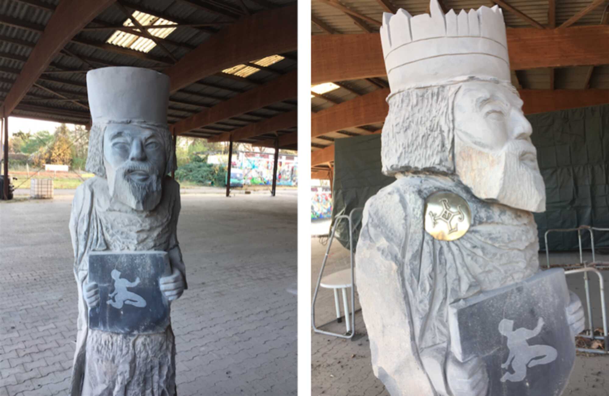Die Skulptur Kaiser Karl von Alfred Mevissen bildet den Start- und Endpunkt des Europäischen Skulpturenwegs. Die Abbildungen zeigen die Skulptur in zwei verschiedenen Entwicklungsstadien.