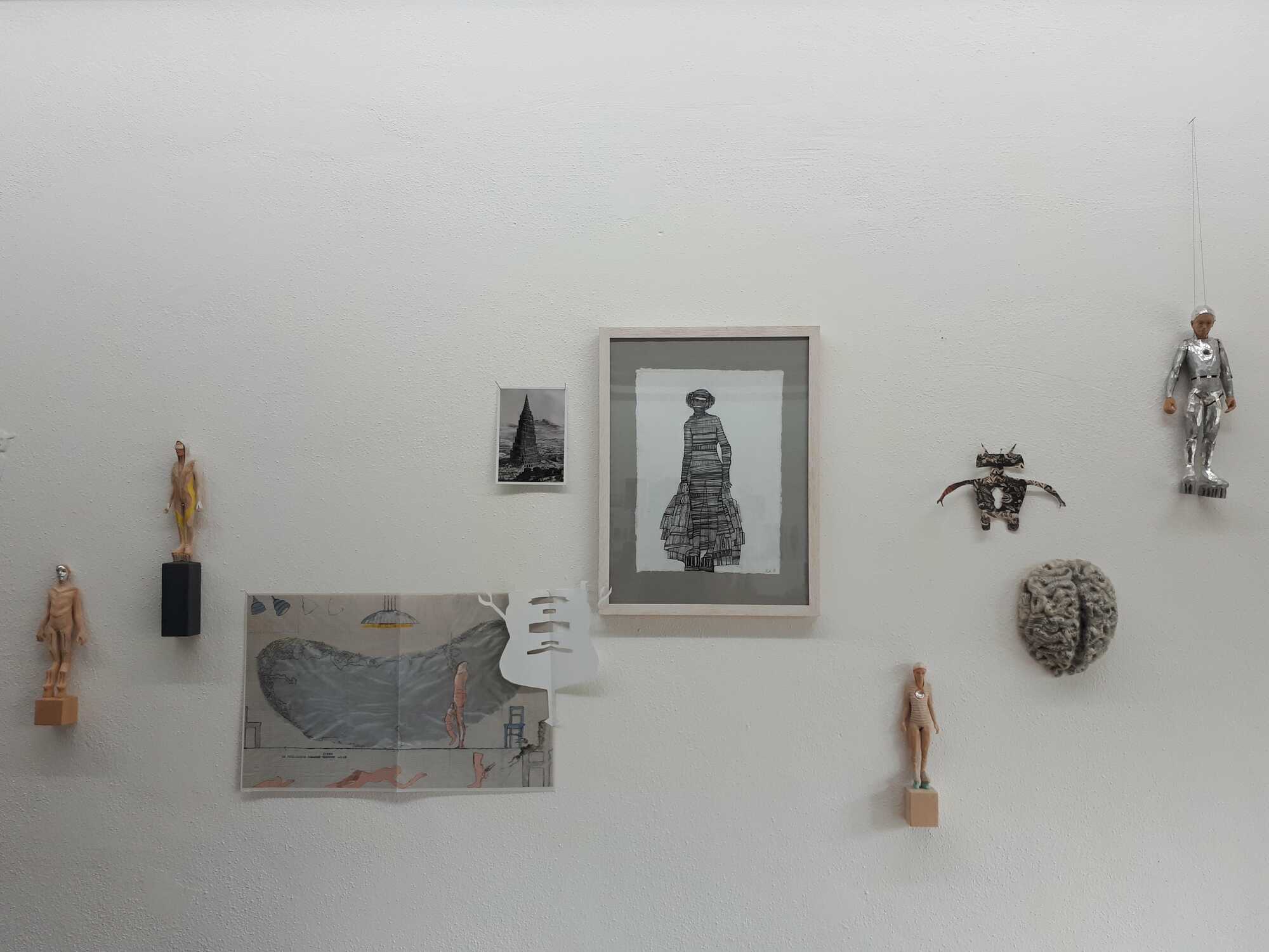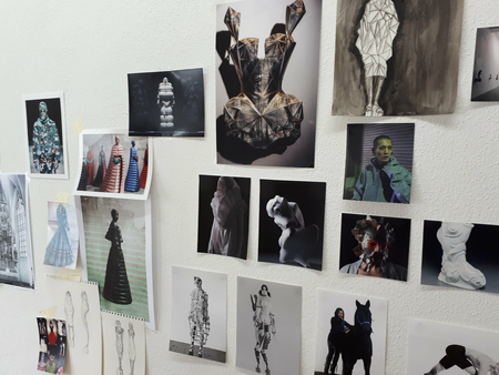Die Wände deines Ateliers sind voll mit Zeichnungen und Fotos. Neben einem Cyborg hängt ein Bild eines Altars der Spätgotik. Wie in deinen Figuren treffen auch hier wieder traditionelle und futuristische Elemente aufeinander. Was reizt dich an dieser Kombination?
