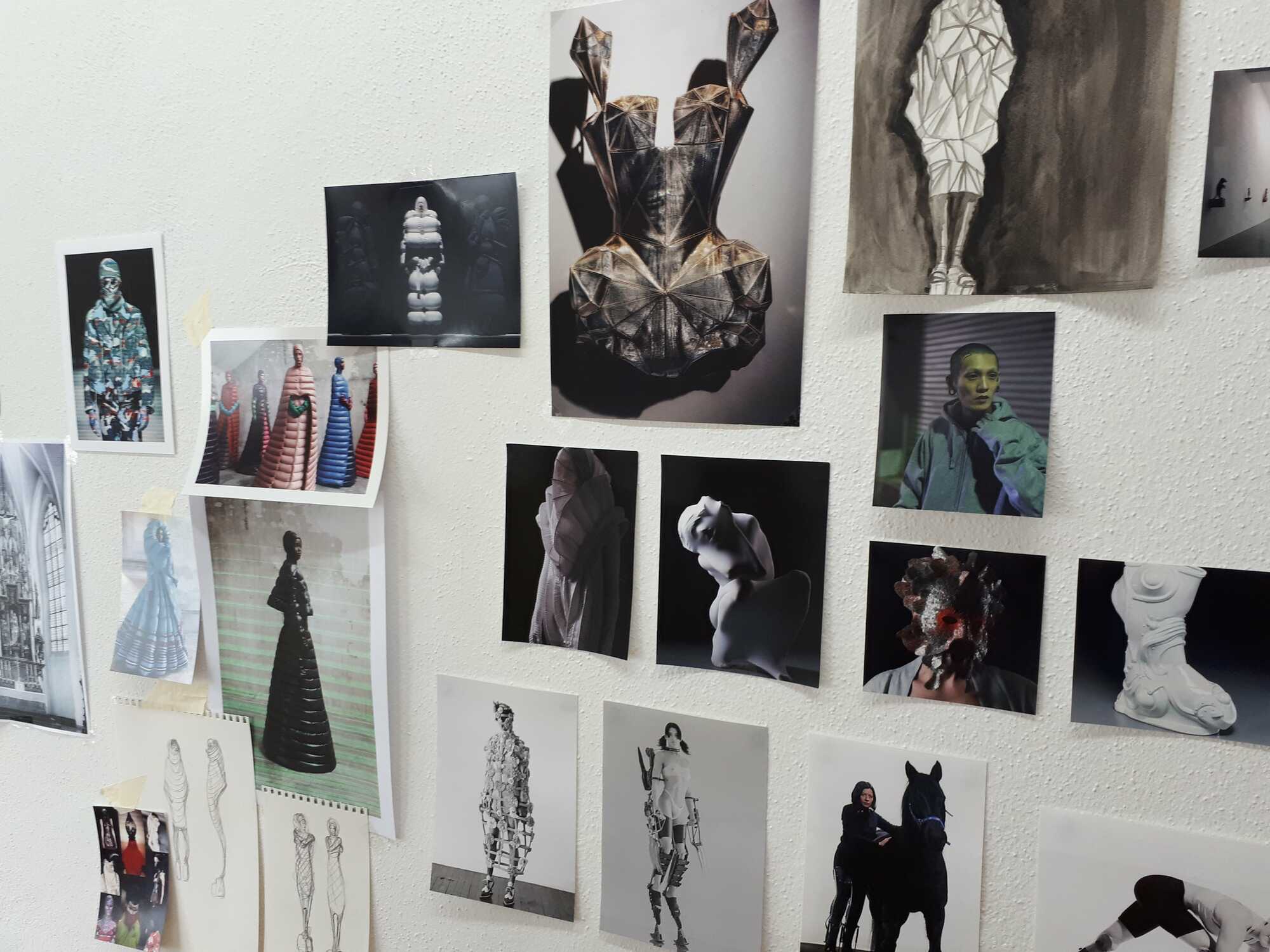 Seit Beginn der Pandemie hat sich mein Thema etwas weiter und in eine neue Richtung entwickelt. Ich beschäftige mich mit Schutzkleidung und Maskierung. Das ist ja im Moment omnipräsent. Dazu stelle ich mir viele Fragen. Wie entwickeln wir uns in Zukunft als Menschen weiter? Welche technischen Implantate und Körpererweiterungen werden wir in Zukunft haben? Welche Schutzkleidung wird unser Gewand ersetzen? Es gibt dazu viel in der Mode zu finden, besonders bei der französischen Firma Moncler, deren Daunenkreationen gleichzeitig humorvoll und sakral wirken. Aber auch Prothesen und technische Körpererweiterungen spielen mit rein. Hier ist die koreanische Bildhauerin Lee Bul mit ihren Cyborgs eine Inspirationsquelle.