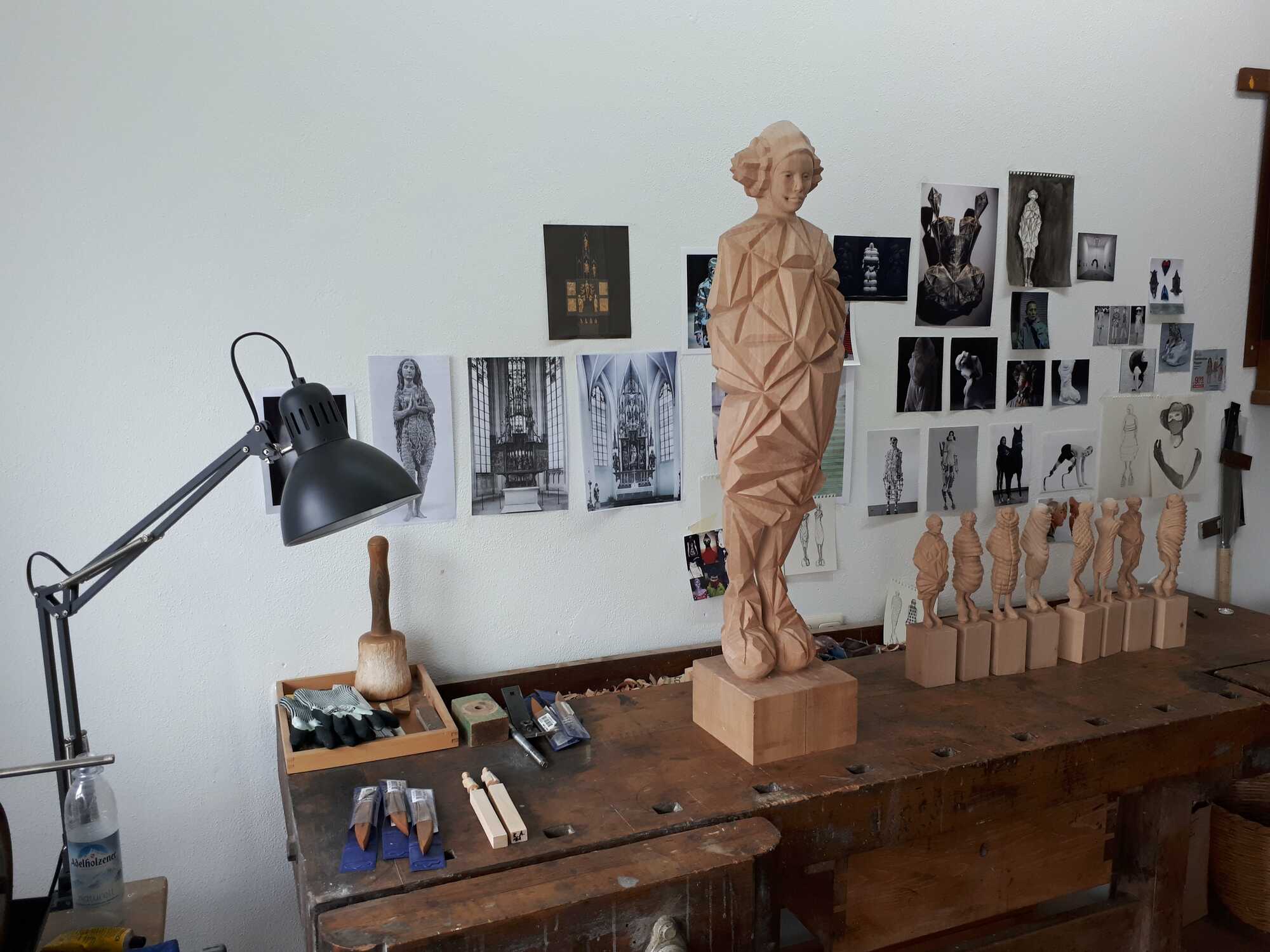 Etwa zwei Monate für eine Figur, bei filigraneren Arbeiten aber auch länger. Die Entwurfsphase beginnt immer mit einem kleinen Modell. Das ist für mich eine Art Ideensuche, aber gleichzeitig auch eine eigenständige Arbeit. Daraus entsteht meistens eine Serie von ungefähr zehn kleinen Figuren. Im Anschluss suche ich mir fünf aus und vergrößere sie. Es dauert mehrere Wochen, sie zu schnitzen und zu fassen.