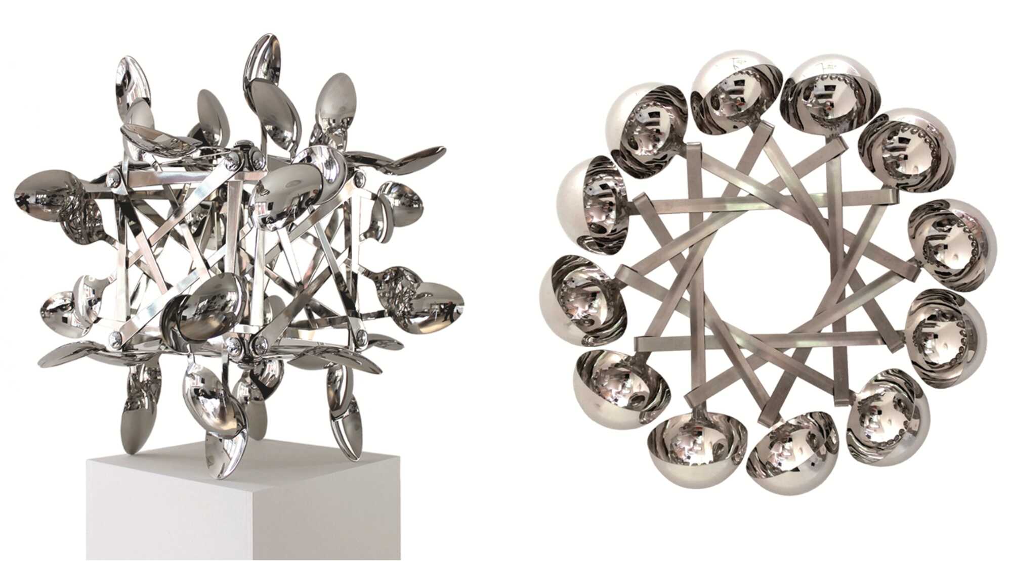 Heinz Bert Dreckmann, links: Gemüselöffel verschraubt, 2015, 54 x 54 x 54 cm; rechts: 12 Schöpfkellen verflochten, 2017, Durchmesser 74 cm x 17 cm;