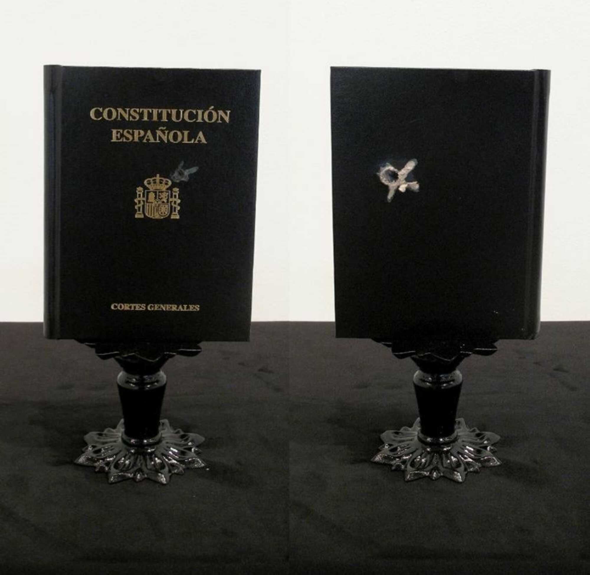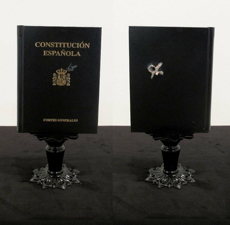 Ebenso wichtig ist es, das Werk von Jorge Garcia (1977, Toledo) hervorzuheben. Er greift den Gedanken der Erinnerung auf und wendet ihn auf das Persönliche an, mit einem gewissen politischen Touch. Seine Skulpturen verweisen direkt auf soziale Konstrukte wie Grenzen, Barrieren und Mauern. Diese Begrenzungen stehen immer in Bezug auf das Thema Isolation, und die damit verbundene kollektive Erinnerung eines Landes, das sich unter der Diktatur in einer Form von Abgrenzung befand. In seinem jüngsten Projekt Vom Großen Anderen zum Objekt von verwandelt Garcia die Gewalt durch Waffen in eine Übung der Bildhauerei. Durch das Schießen auf eine Reihe ihm wichtiger Bücher, wie das spanische Grundgesetz, die Bibel oder Marx‘ Kapital, tötet er seinen Vater und mystifiziert, was von ihm übrigbleibt – dadurch entstehen Reliquien, die wiederum zur Skulptur werden, aber: zur traumatisierten Skulptur.