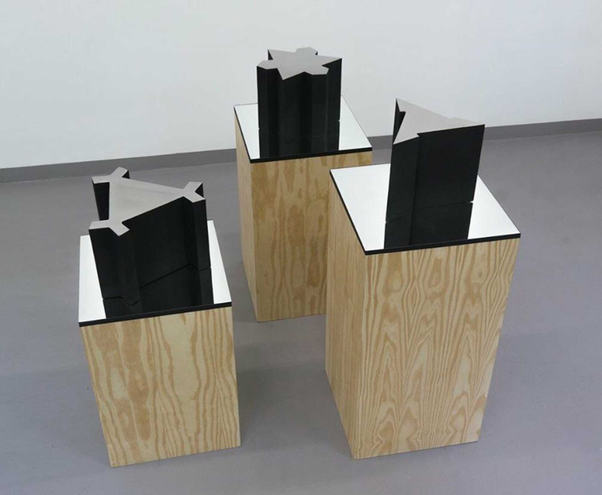 Jorge Garcia, Architektur der Abwehr I, II und III (2015), Eisen mit Farbe und polierter rostfreier Stahl