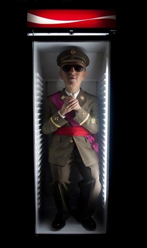 In den vergangenen Jahren, seitdem Merino auf der ARCO-Messe sein Werk Franco im Coca-Cola-Cooler vorgestellt hat, wurden wir regelrecht überflutet mit einem Wasserfall von Informationen: Die Klage der Franco-Stiftung (von deren unwahrscheinlicher Existenz viele erst durch diesen Prozess erfuhren), das Gerichtsverfahren, die darauf folgenden Ereignisse und der letztendliche Sieg der Meinungsfreiheit. Darauf folgte wiederum ein zweites Gerichtsverfahren der Stiftung gegen das Werk Punching Franco, bei dem der Kopf des Diktators mit einem blauen Auge auf einem zum Boxen gedachten Punchingball abgebildet ist. Der Prozess nimmt nun seinen gerichtlichen Lauf in einer Art ermüdenden Dauerschleife, erschöpfend für jedermann, allem voran für den Künstler. Merino ist einer der interessantesten Kunstschaffenden in diesem fluiden Panorama von politischer Kunst. Denn das kritische Ausmaß seiner Werke, die Bezug nehmen auf den Diktator und die sozialen Auswirkungen seiner Politik, wirkt wie ein glasklarer Spiegel, der der spanischen Gesellschaft von 2021 vorgehalten wird. Sein Werk hinterfragt die Erinnerung des Diktaturtraumas, die in der Zeit stillsteht, ebenso wie die endlose Wiederholung einer Bildsprache, die fortbesteht zum Trotz aller folgenden Generationen.