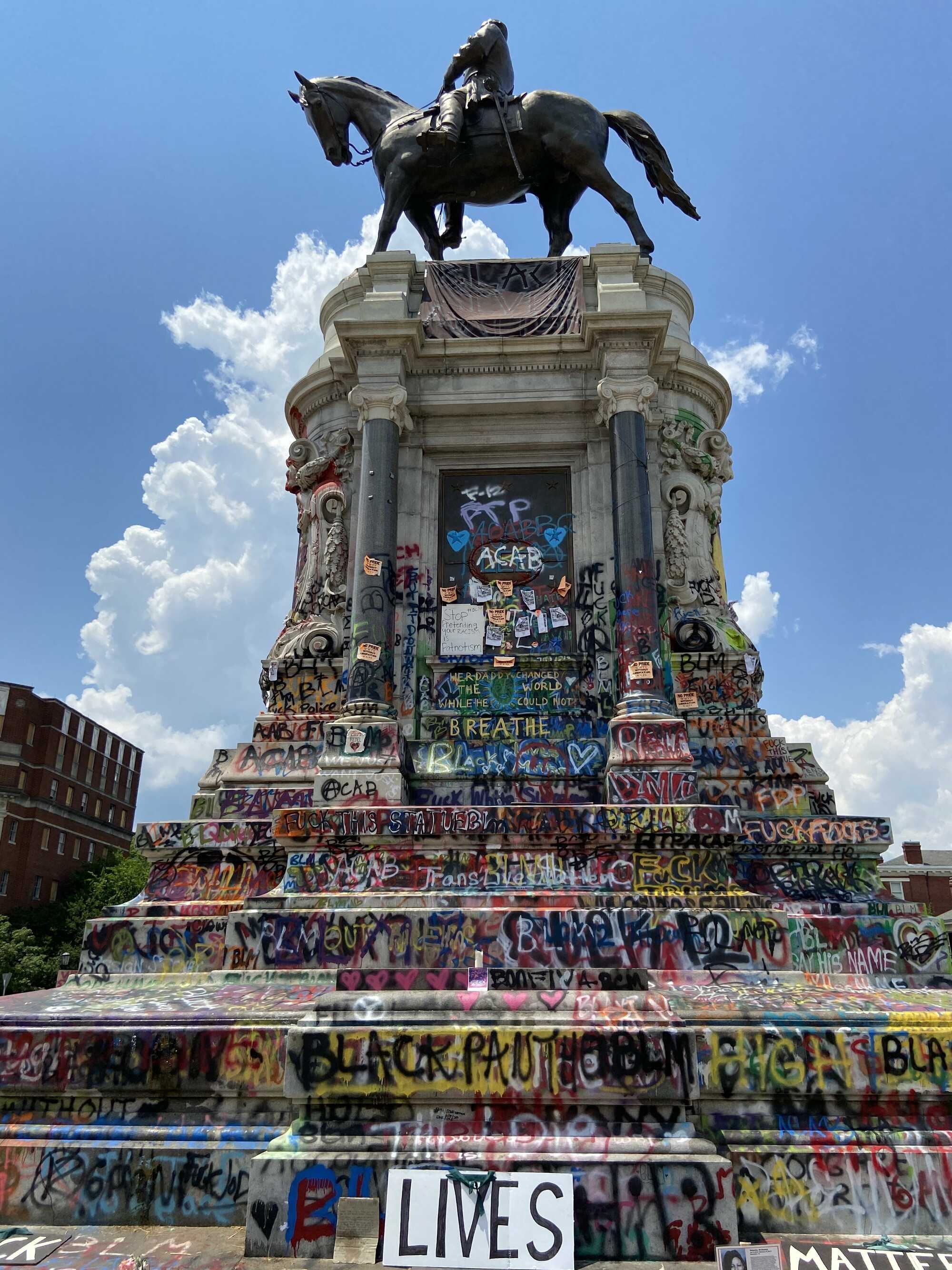 (3) Denkmal des Südstaaten-Generals Robert E. Lee in Richmond, Virginia, nach Black-Lives-Matter-Protesten im Juli 2020. Foto: Mk17b (https://commons.wikimedia.org/wiki/File:Defaced-lee-statue-2020.jpg), „Defaced-lee-statue-2020“, https://creativecommons.org/licenses/by-sa/4.0/legalcode
