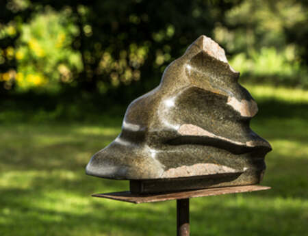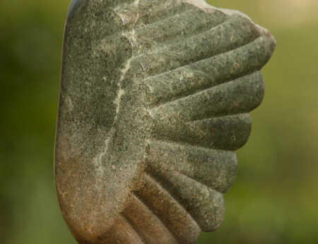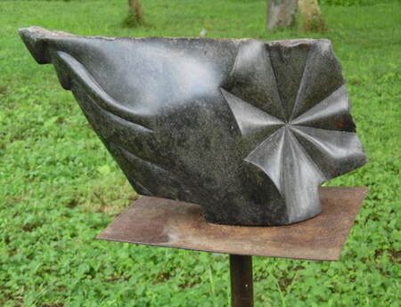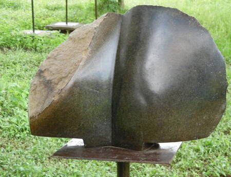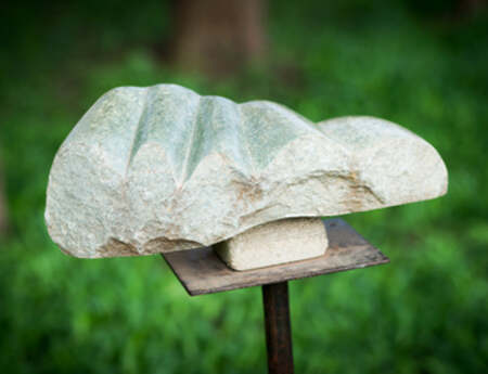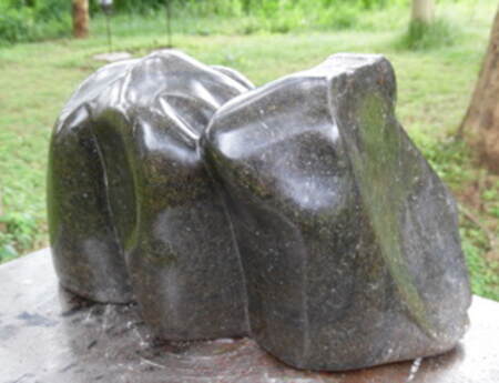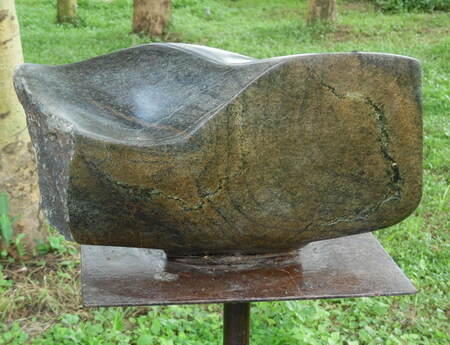 Since that time she has been creating stone sculptures in her garden, by the shade of the fever trees. The two kinds of stones she works with, Opale and Serpentine, both come from Zimbabwe.