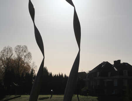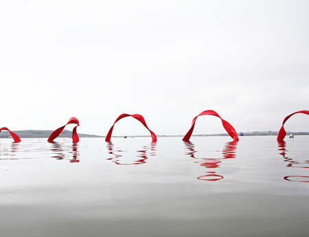 One of Rebecca's floating works is Wave, a 15m installation, which was commissioned for a private lake in Yorkshire in 2013 and considers the ever increasing volume of information which invisibly surrounds us. The five sections have an internal steel structure, have a highly polished red surface and are invisibly chained together and anchored to allow the work to respond to wind and water flow. Wave is red because in the colour spectrum, red appears at this wavelength.