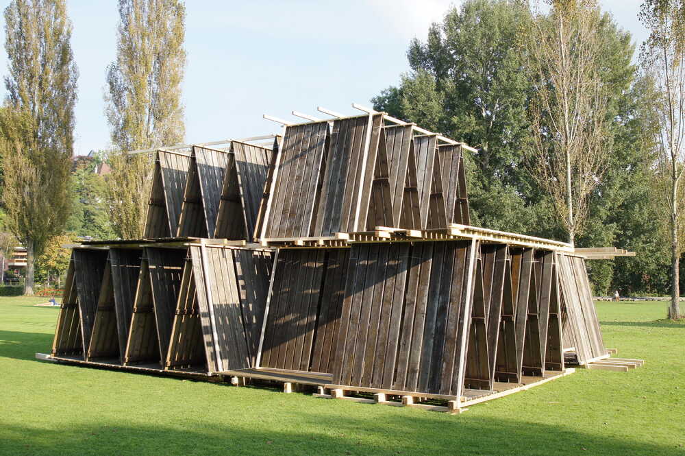 Temporary construction of 200 wooden sun loungers at outdoors pool Marzili, Bern