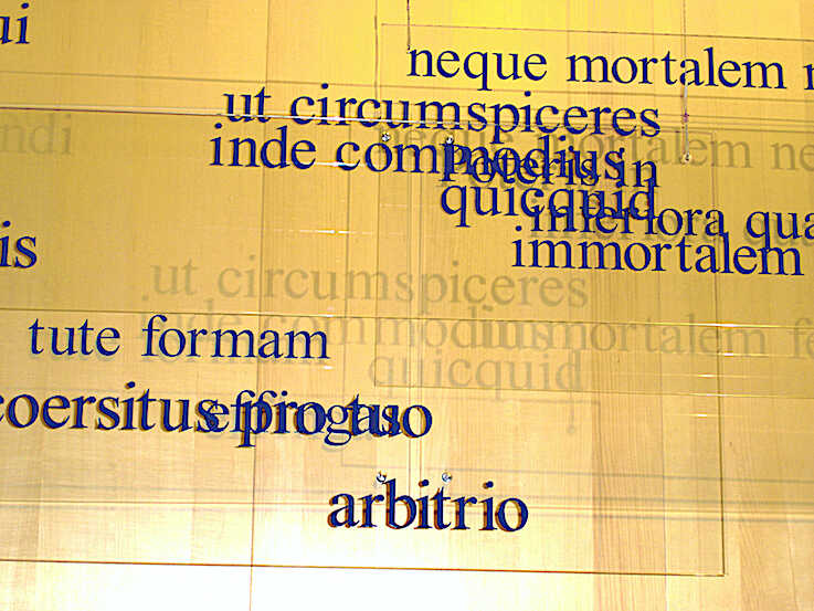 De Hominis Dignitate / Ecxerpts of the great speech by Giovanni Pico della Mirandola from 1488 with serigraphy on glass-sheets with dark blue colour. Shadows of the letters on the wall / Situated in the finnish consulate in st.Petersburg Russia
