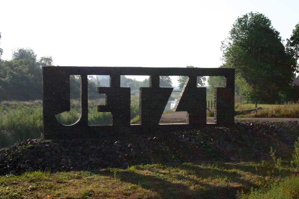 The gabion wall around the cutout word is permanently mounted. The river flows lazily past it. The green of the embankment is cut back from time to time by the officials.