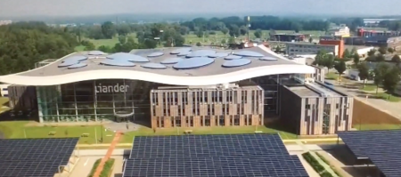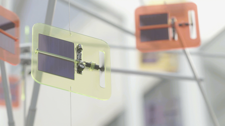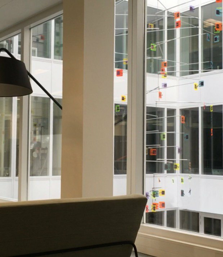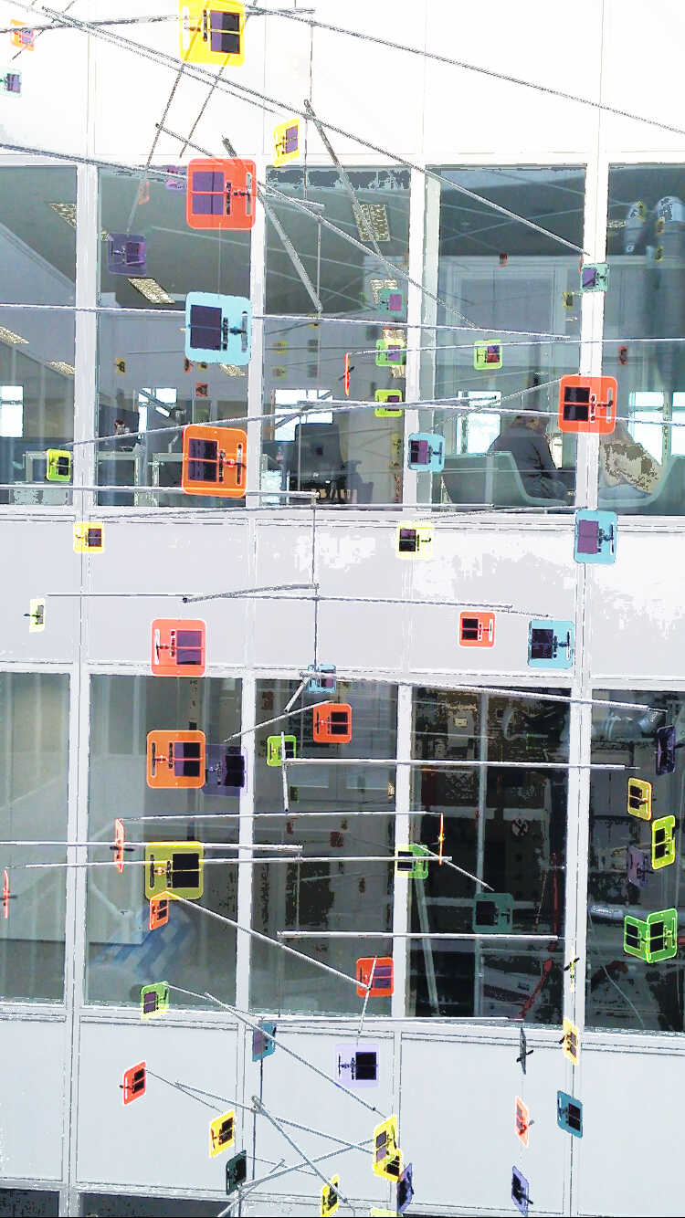 135 of these mini-solar sculptures generate electricity themselves and convert it into motion. They float unpredictably in the air in the new Alliander building. This kinetic mobile is 13 meters high and has a diameter of 9 meters. In the morning it slowly comes to life, during the day it is lively and when the sun sets it slowly comes to rest. It is like a musical instrument that is played by the sun.