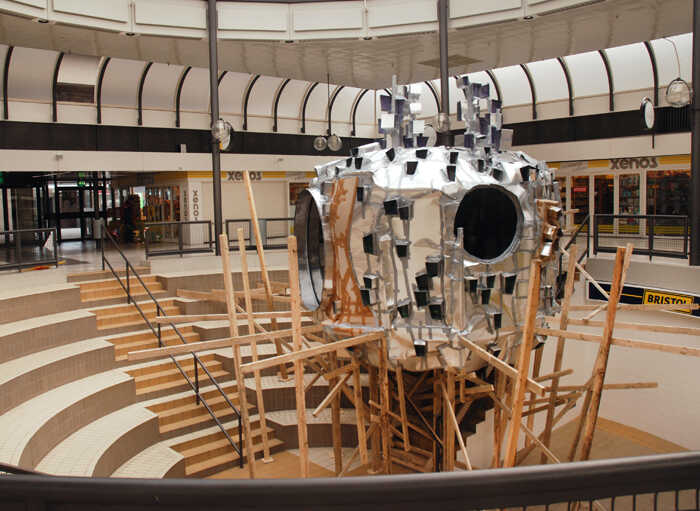 Into the Grid, alluminium, glass, plexiglass and wood.Temporary project inside a shopping-mall