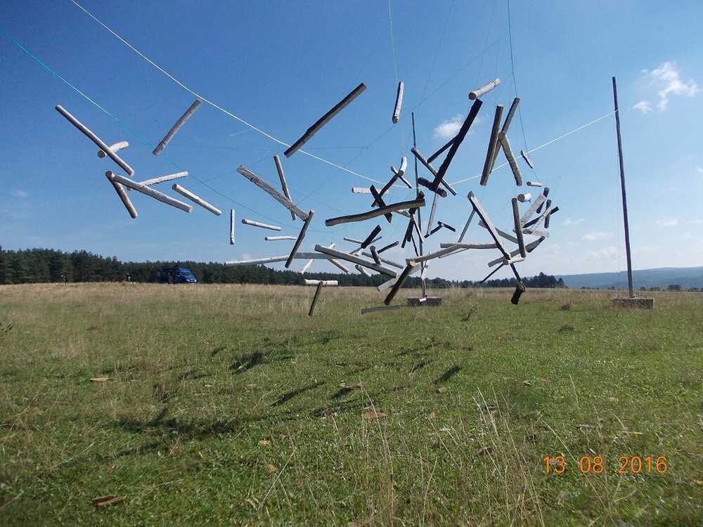 "Black cloud - white cloud" This is a landscape installation realized with my wife Anna as a team at the exhibition and competetion moved wind 2016 / Deisel/ Hessen/ Germany We've got tghe 2. price for it.It's movable and the black and white wooden sticks are also playable like a xylophon by the visitors.