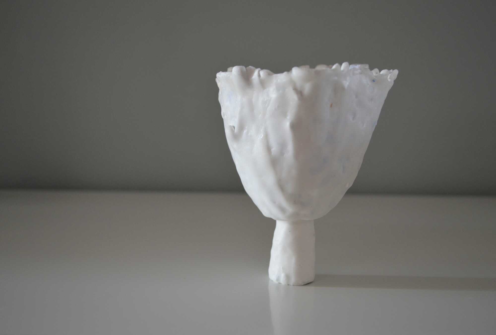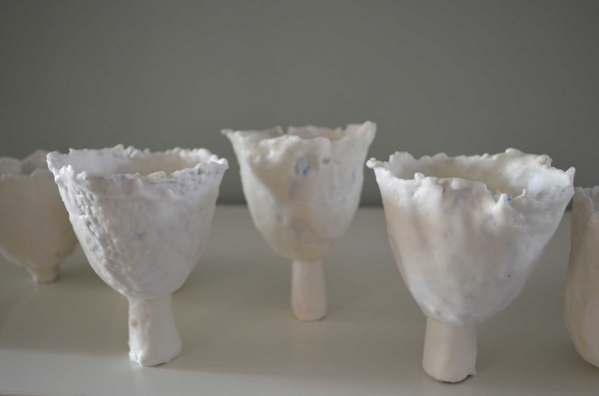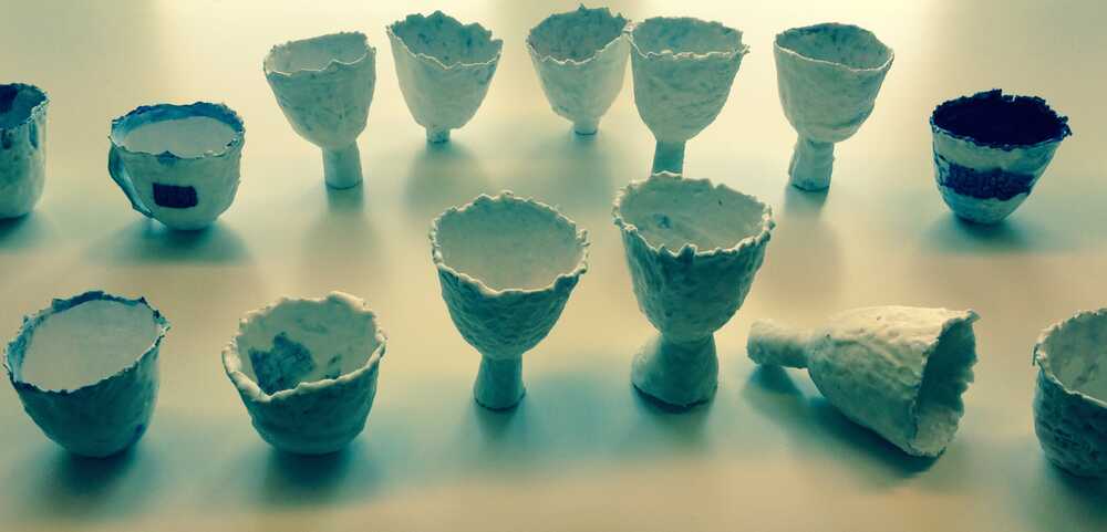 An installation of 30 small cups. The cups' first layer is papier-mache, made from the pages of the personal diaries of the artist. Layers of porcelain-like plaster and beeswax do not totally cover up the writing, but let it shine through. The artist personal feelings are not important, our shared universal feelings as human being are center piece in this installation. '30 Cups' is to be seen as the pages of a journal, every day we drink our cup.