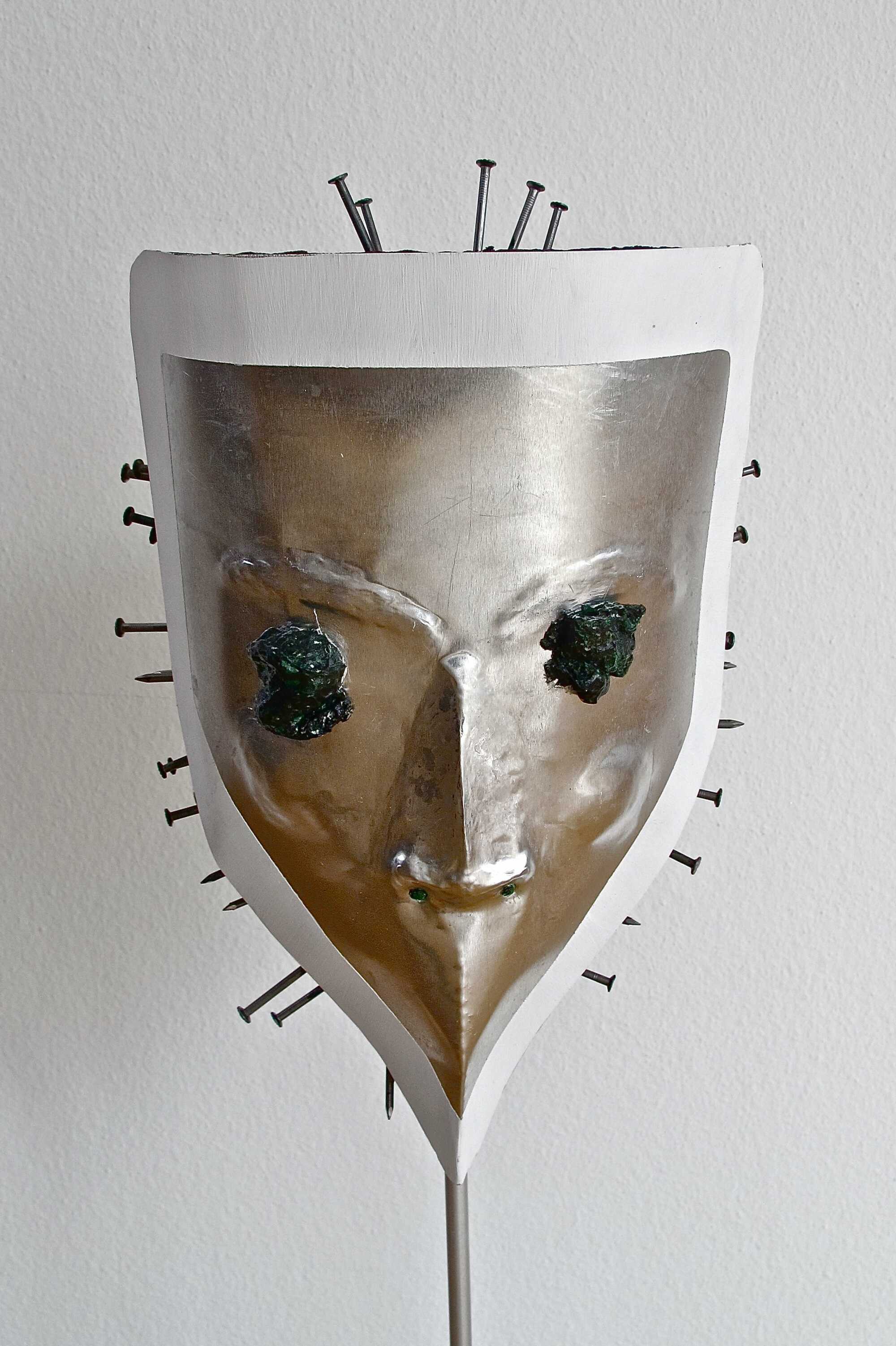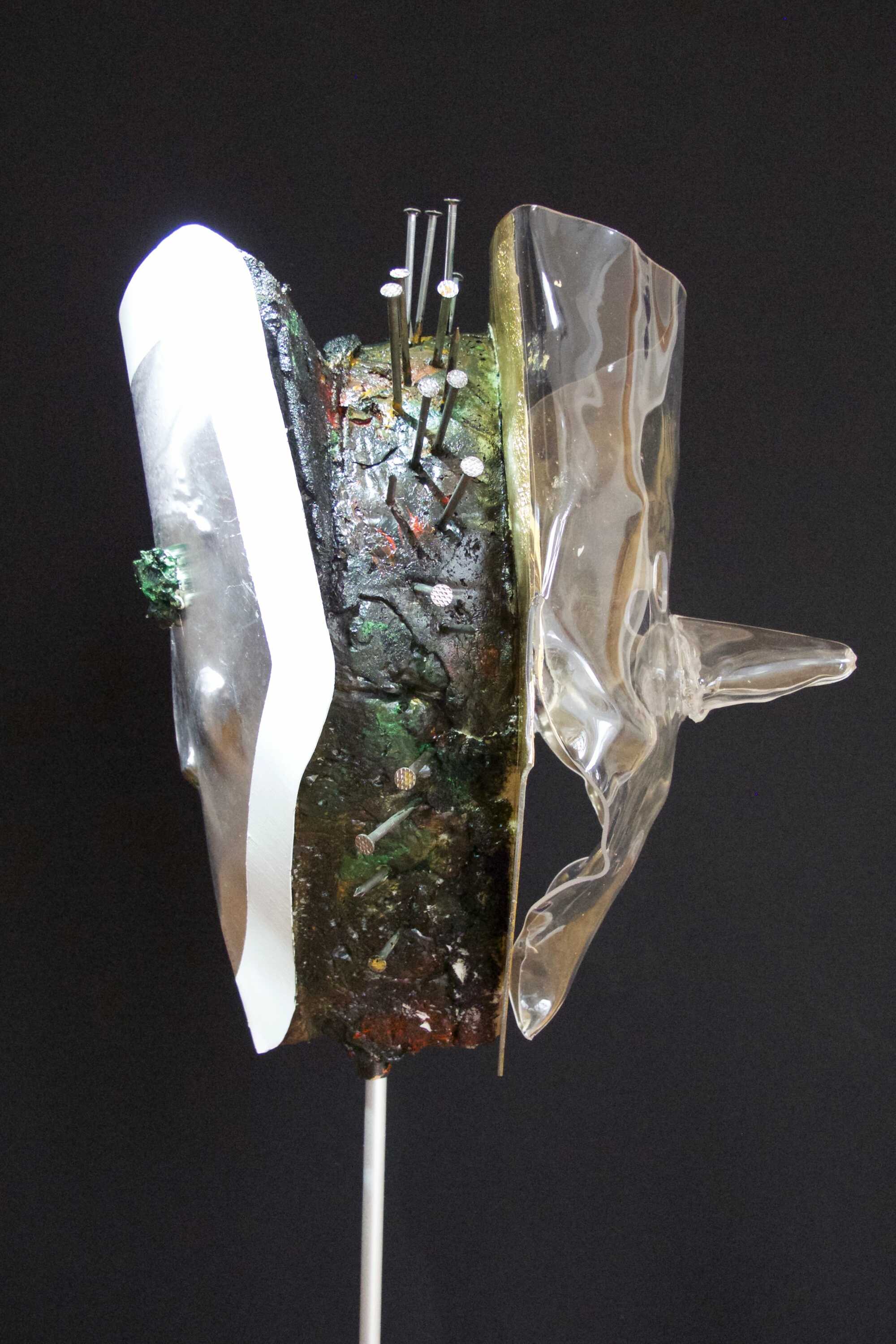 The antipodes in this piece of artwork: the aluminium part and the acrylic glass part clash together and symbolically create the thorny question.