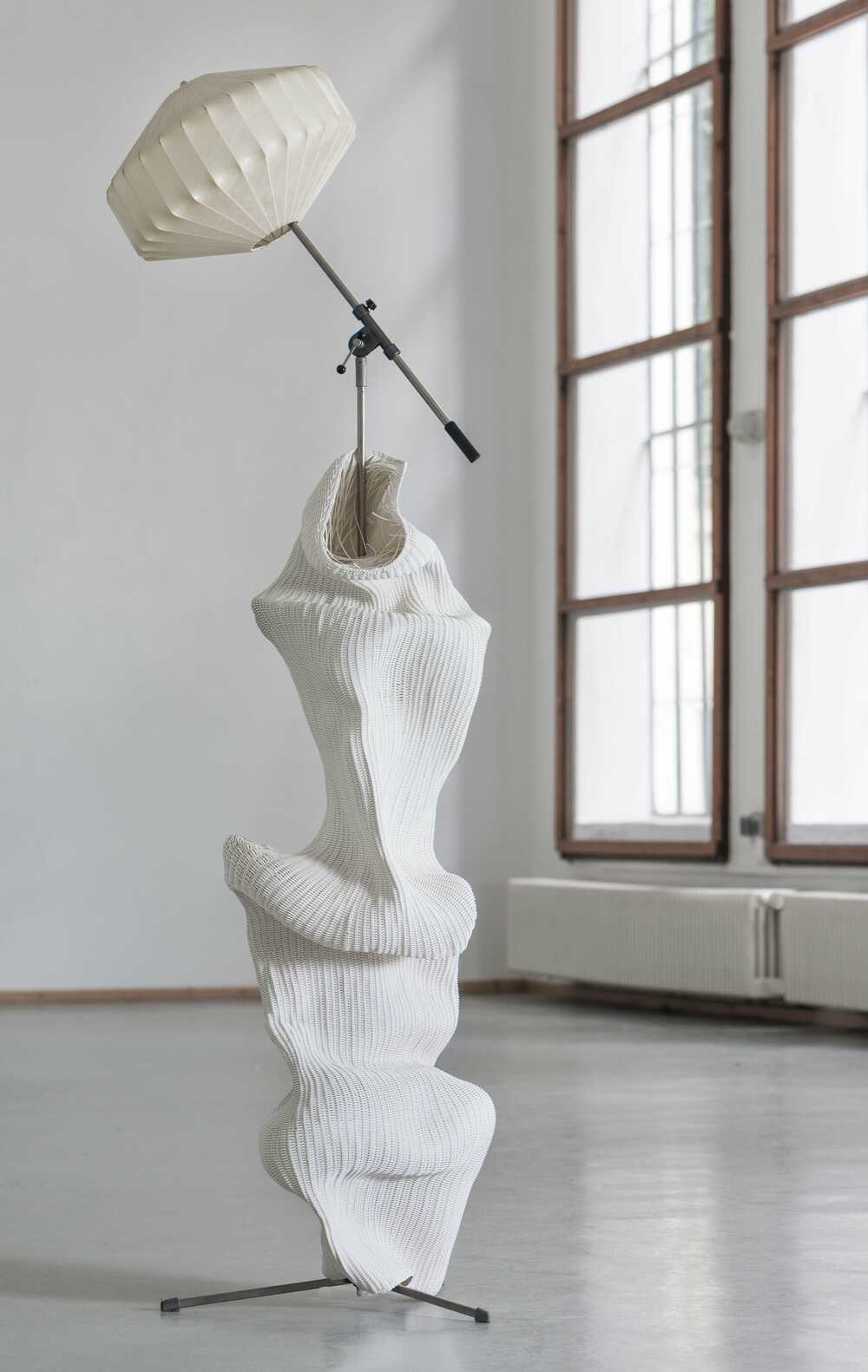 Thin plastic tubes woven by hand over a sub-construction of wooden plates fixed on a threaded rod in combination with mike stand and a lamp of the 70ies.