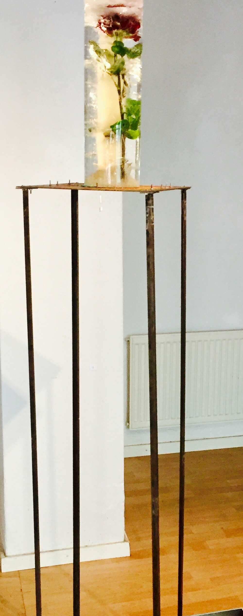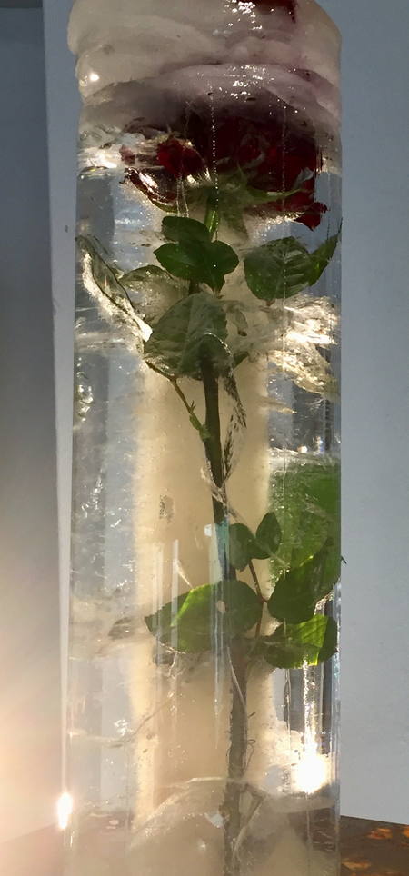 A rose in an iceblock melting slowly into a waterbasin underneath