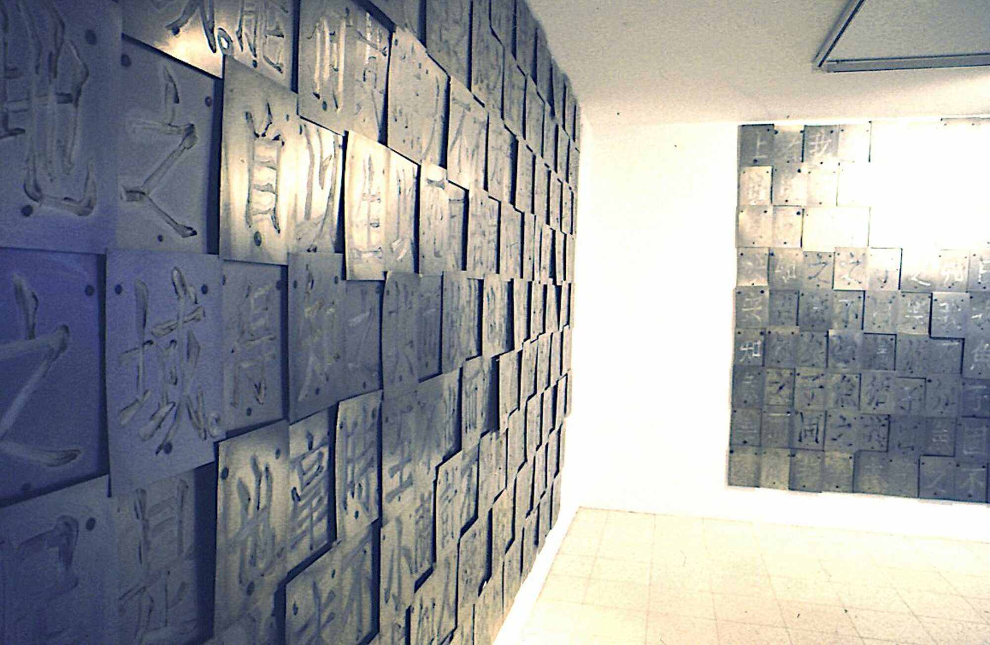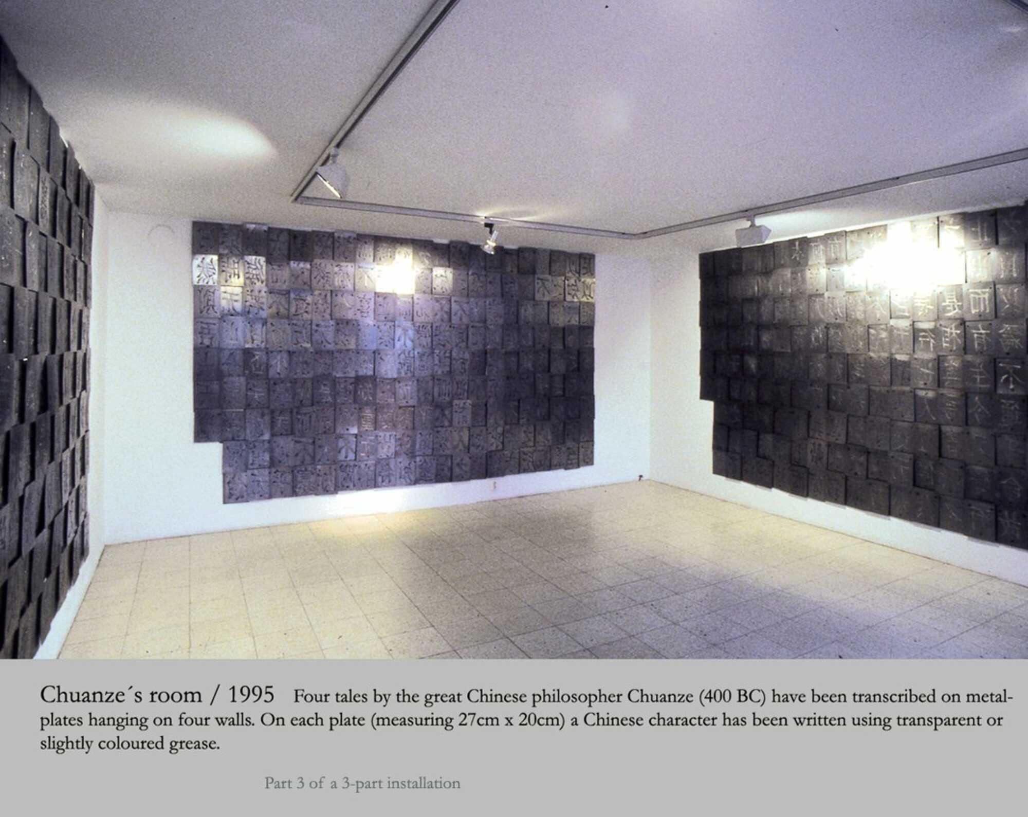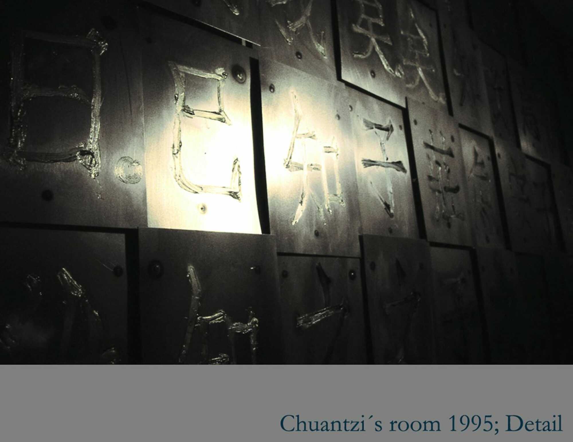 Installation containing text excerpts from Shakespeares dramas, the chinese philosoph Chuantze´s texts and a projection of a rose on fa olded metal mesh.