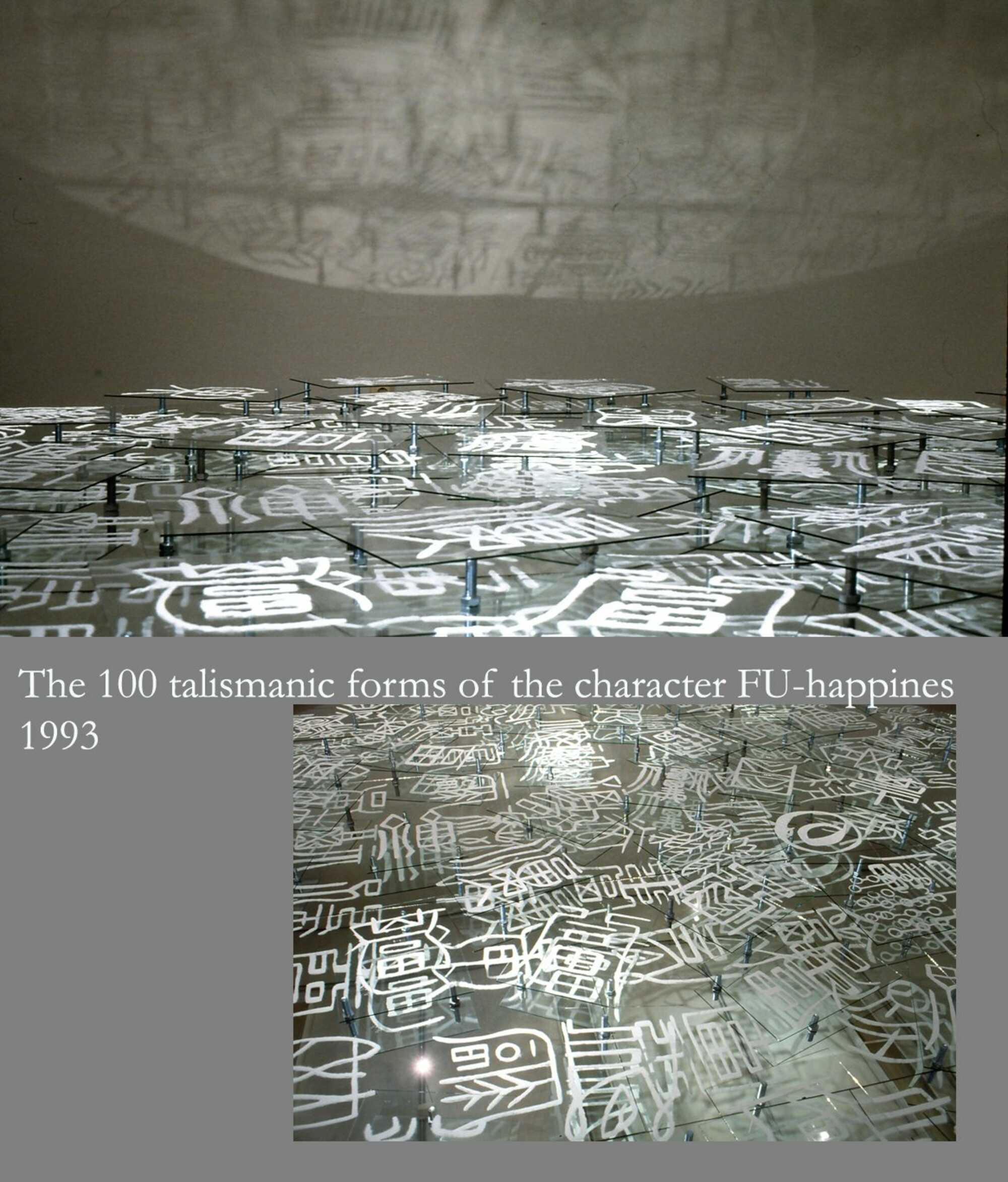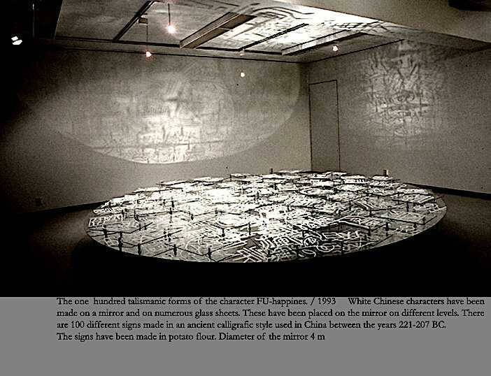 White Chinese characters have been made on a mirror and on numerous small glass-sheets standin on different levels above the mirror.There are 100 different sighn made in an ancient calligraphic style that has been used in China between the years 221-207BC.