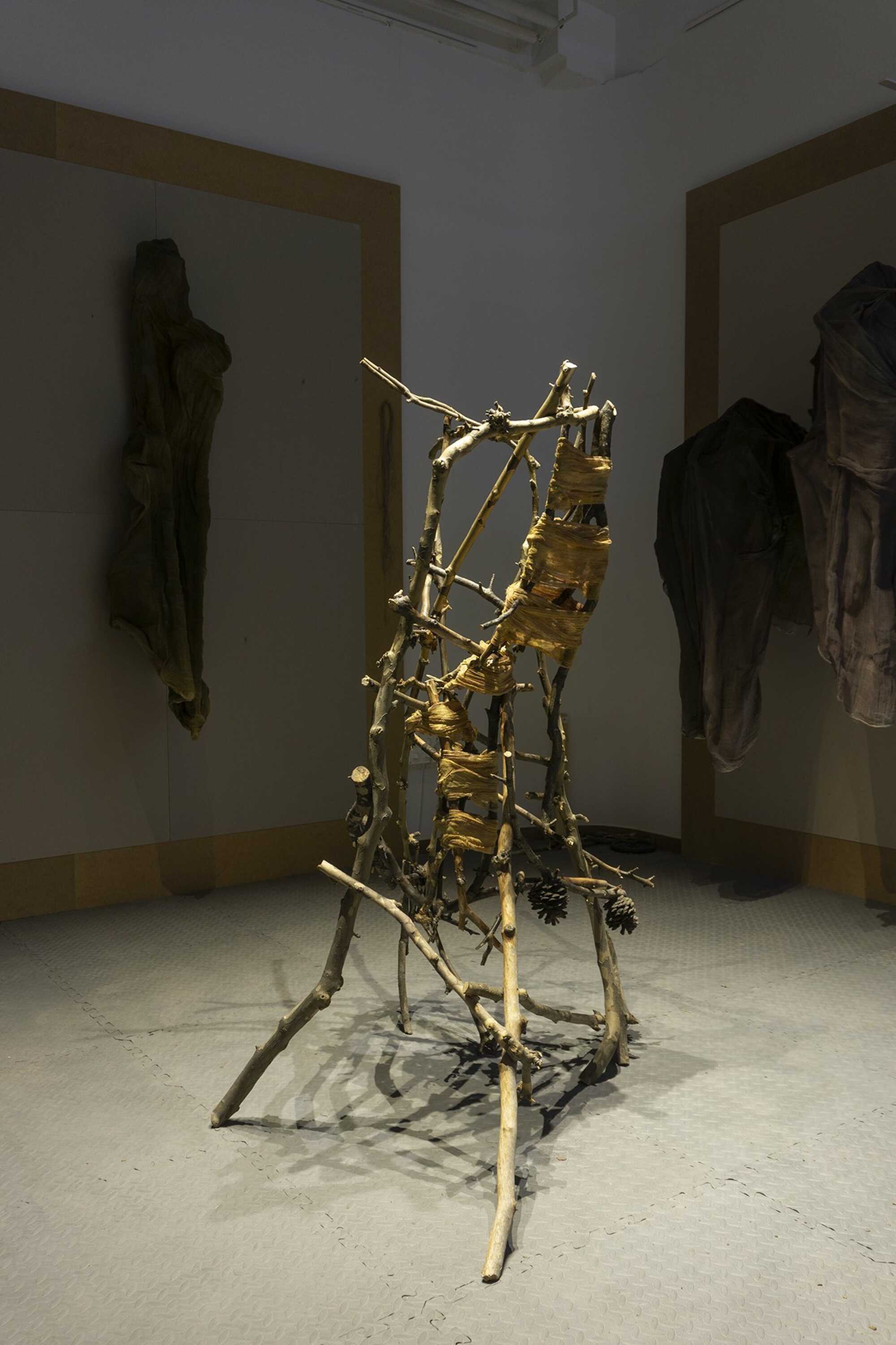 Wall mounted work made with tarlatan gauze, light internal structure, color, small tree branches.