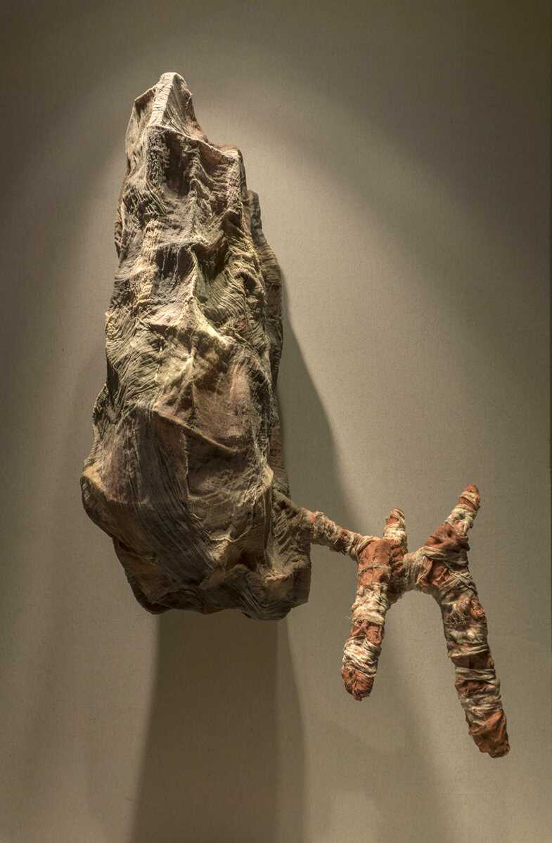 Wall-mounted work made from tarlatan gauze, light internal structure, wood, color.
