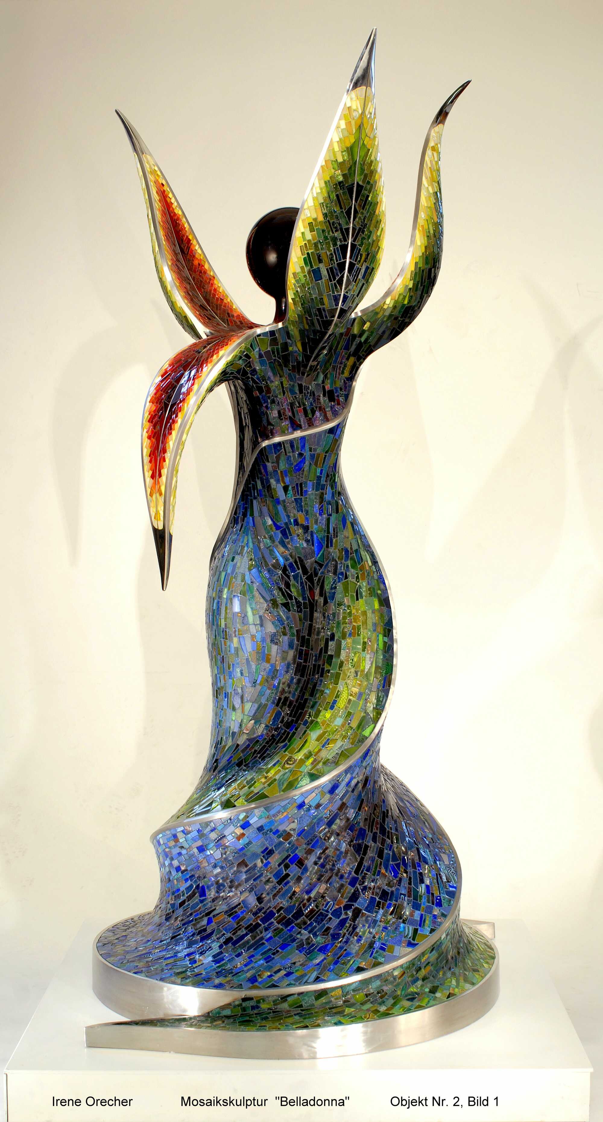 Atropa belladonna - die Schwarze Tollkirsche ... Höhe 2 m ...seit der Antike medizinisch genutzt, gehört das Nachtschattengewächs zu den gefährlichsten Giftpflanzen unseres Lebensraumes ( "atropos"= griech. "unabwendbar", in der griech. Mythologie eine Schicksalsgöttin, die den Lebensfaden abschneidet). Die pupillenerweiternde Wirkung des Beerenwirkstoffes Hyoscyamin prägte im Italien der Renaissance den Namen "bella donna" (ital. "schöne Frau"). Ähnlich einer DNS-Doppelhelix schraubt sich ein "neues Wesen" empor: halb Pflanze, halb Frau - wie auch die Skulptur "Brandung" Symbol für Dualität, Spannung und Polarität im Leben, für Schönheit und Verderben, Leben und Tod.