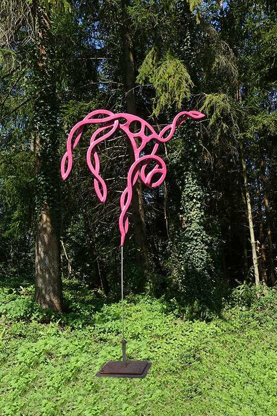 Eschenholz, Ölfarbe, Federstahlstange, Eisensockel