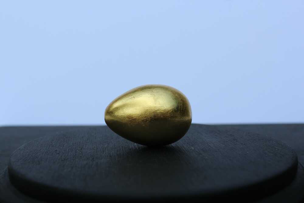 Ein mit Blattgold gefaßtes, geschnitztes Ei aus Lindenholz.