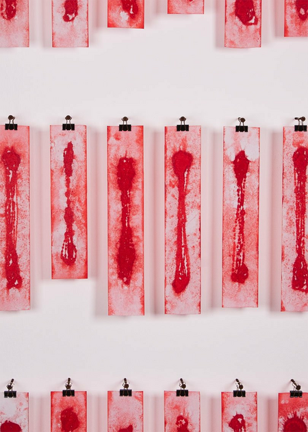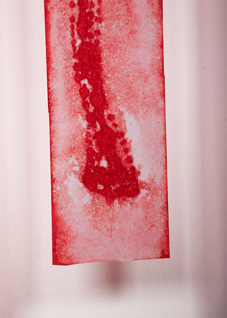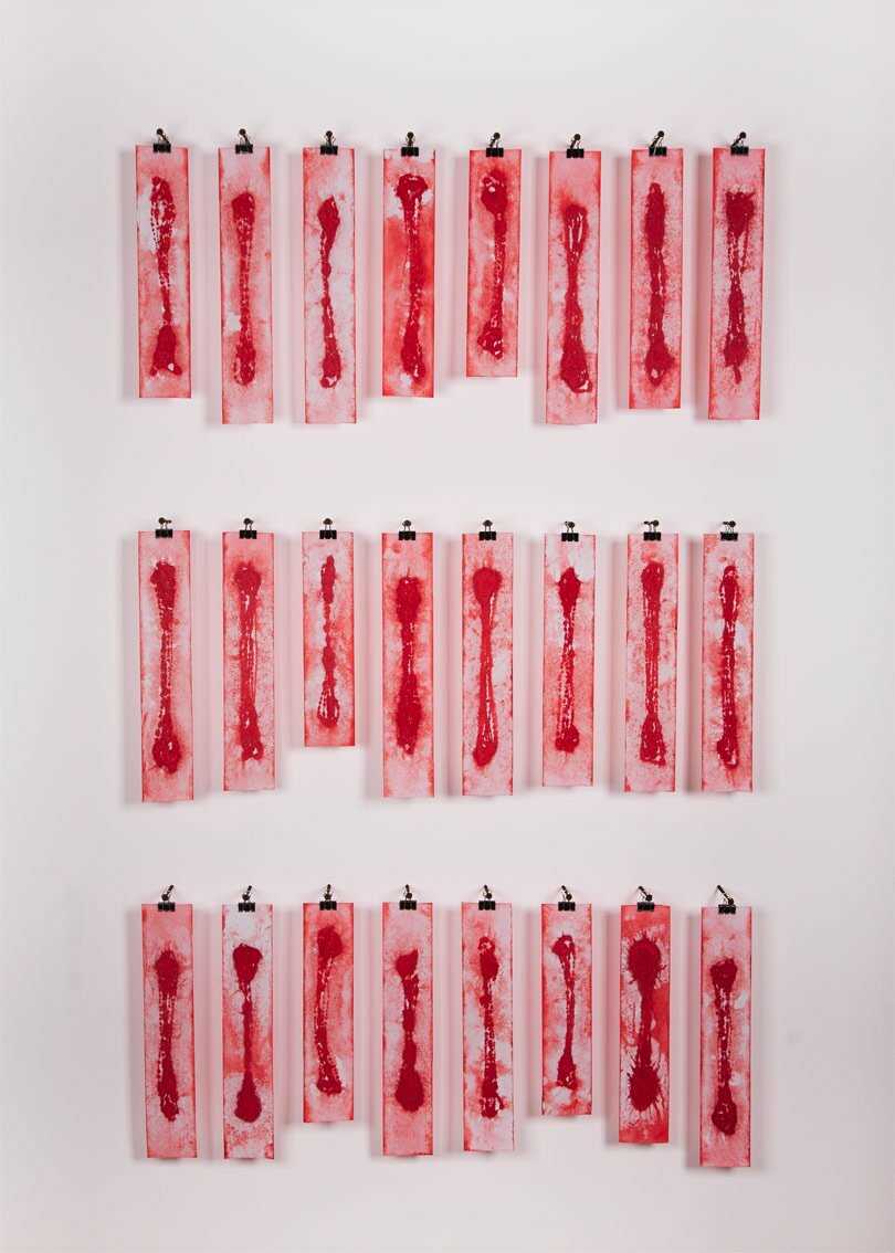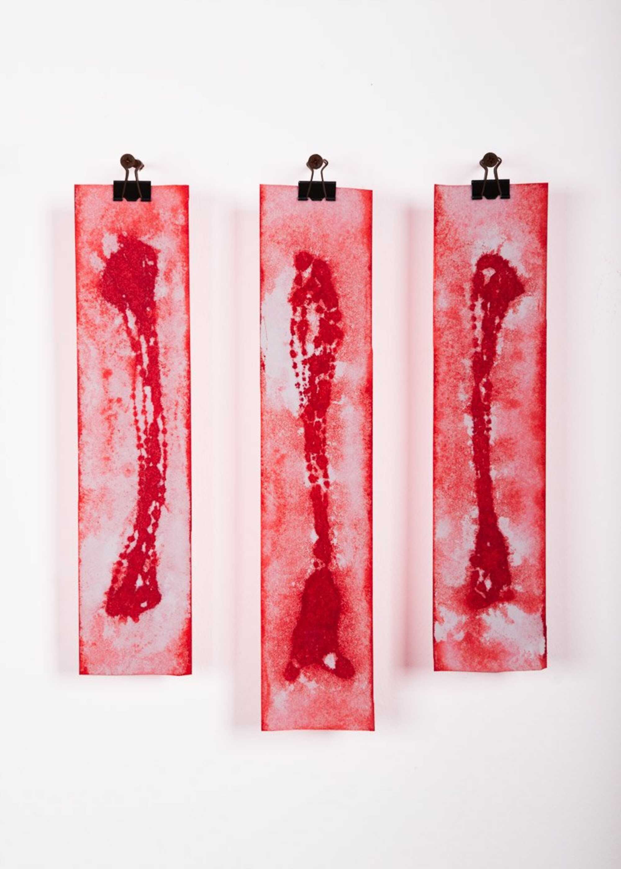 Bones are created with a pendular movement. As an installation it could be the result of an excavation. The transparent facing catches the light like a winding-sheet, a glimpse of what has been…