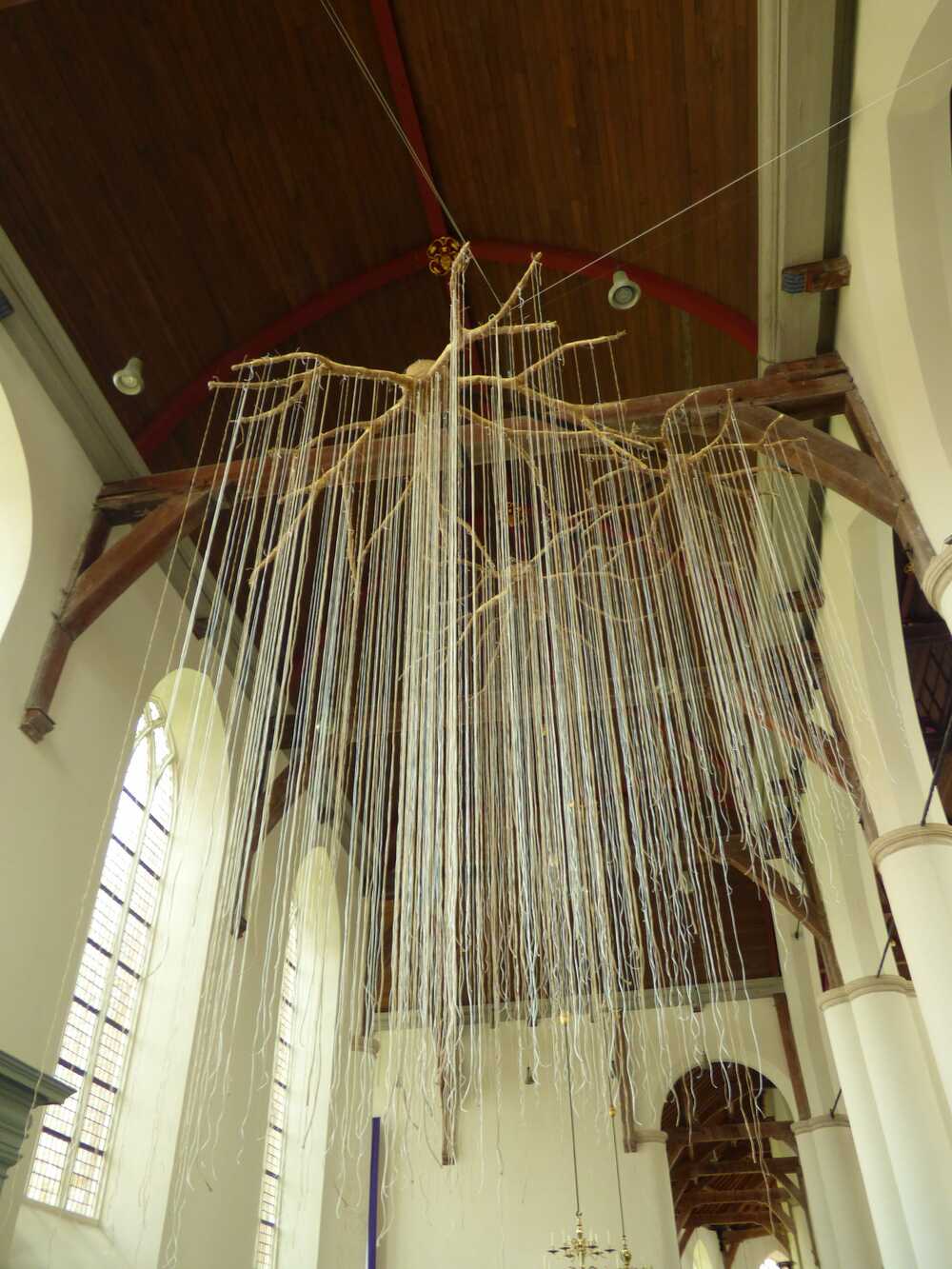 I often make installations with threads in trees. In this show we go into the air, and therefore I choose to show the underside of tree, and the connectedness that exists in the siol. The network of roots with which trees are connected and communicate. By tying large numbers of threads to the roots I create en ethereal image, a contrast with the firm, rooted root system.