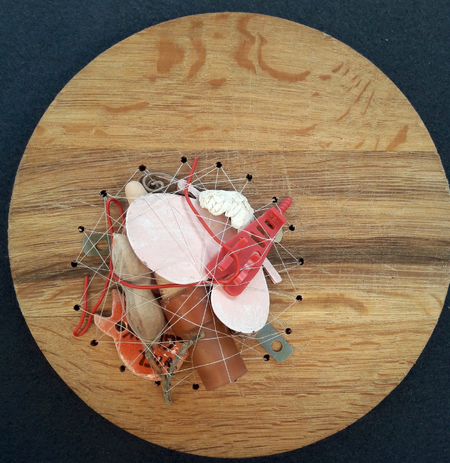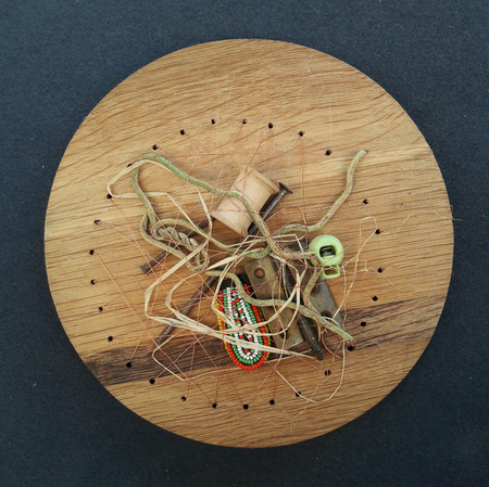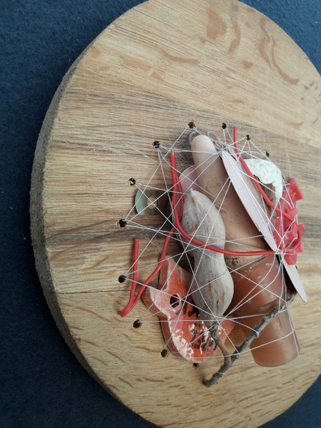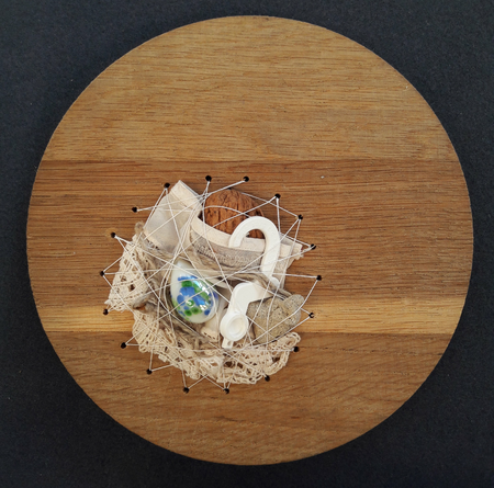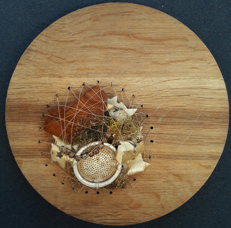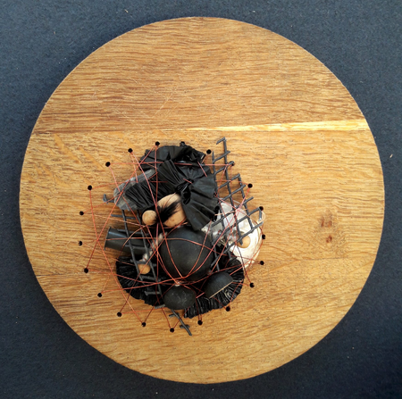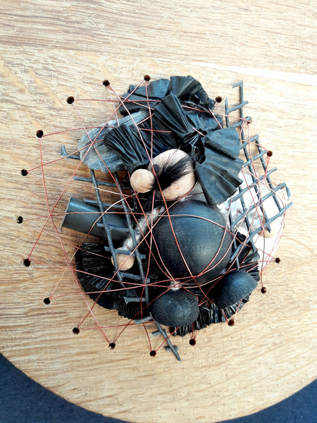 Used and found materials are bound together in a confined round space by copper wire or thread. This series of works dates back to 2017 and has become a vivid image for 2020/2021's governmental refinements people all over the world experienced.