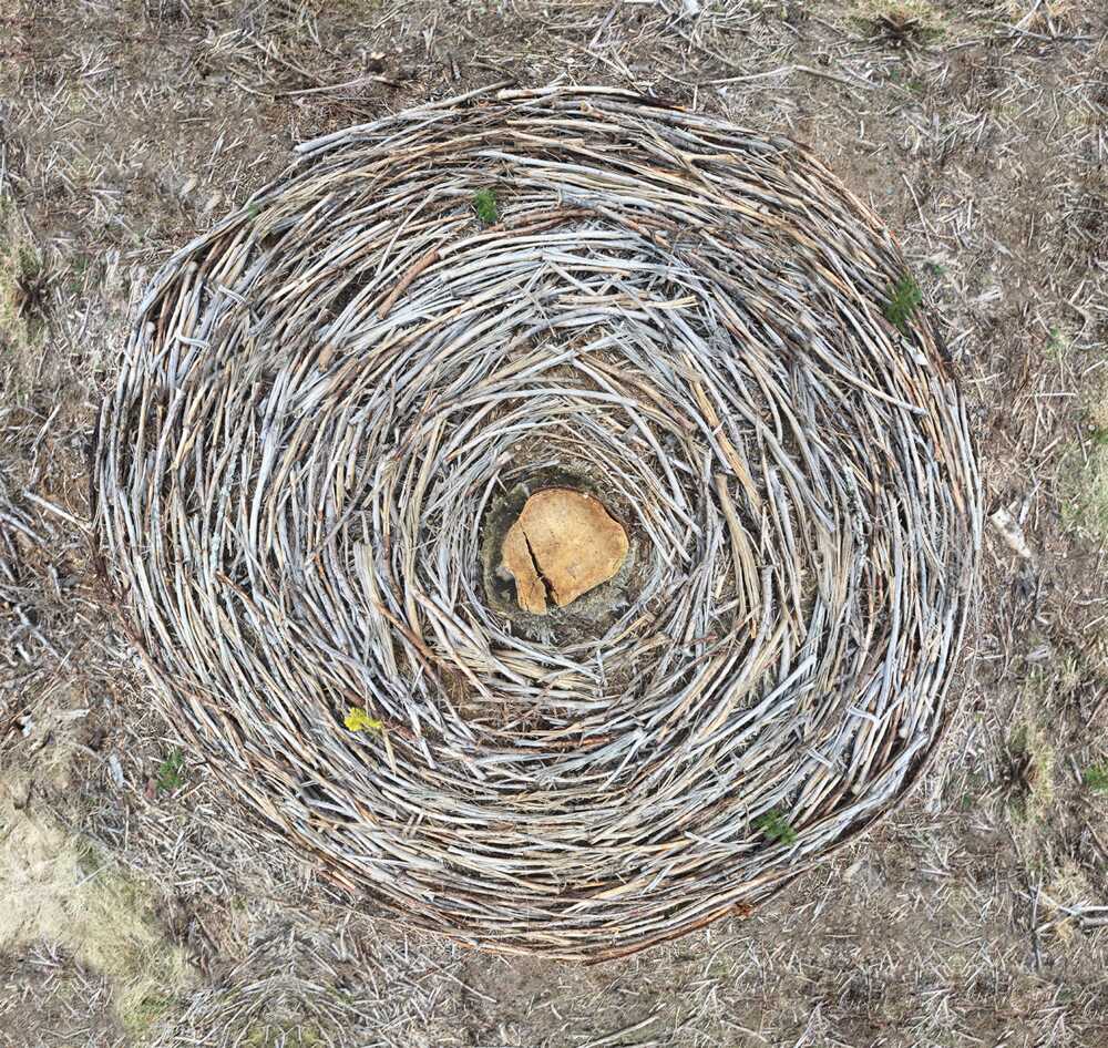 Verwitterte Tannenäste gruppieren sich um einen Baumstumpf. Wie ein Magnetring zieht der Baumstumpf die Äste an.