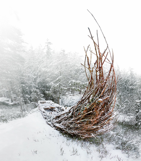 Auf einem Hügel steht die Wooden Ark. Gebaut aus Tannen- und Birkenästen und Zweigen. Die Zweige und Stämme wurden gesteckt und teilweise mit einer Naturschnur fixiert. Die Wooden Ark hat im Bug einen grossen Findling und symbolisiert die Überfrachtung und Überforderung der Natur durch den Menschen.