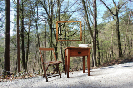 Ein Stuhl, ein Sekretär, ein Bilderrahmen sind am Rande eines Waldweges installiert. Ein Buch mit Gedichten von Lord Byron liegt auf dem Sekretär. Die Besucher der Ausstellung im Wald halten inne und lesen ein Gedicht, eine Hymne an die Natur, von Lord Byron.