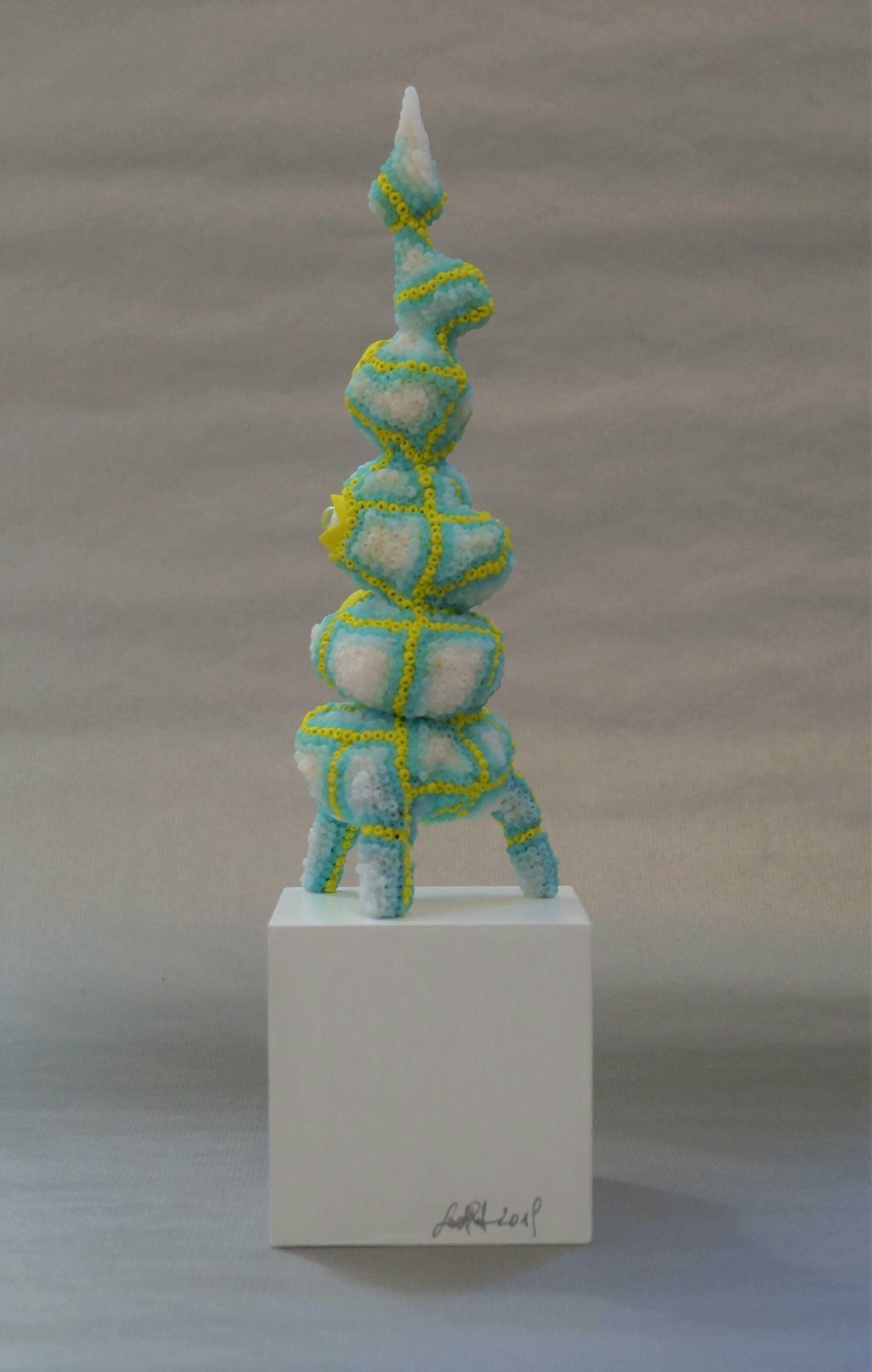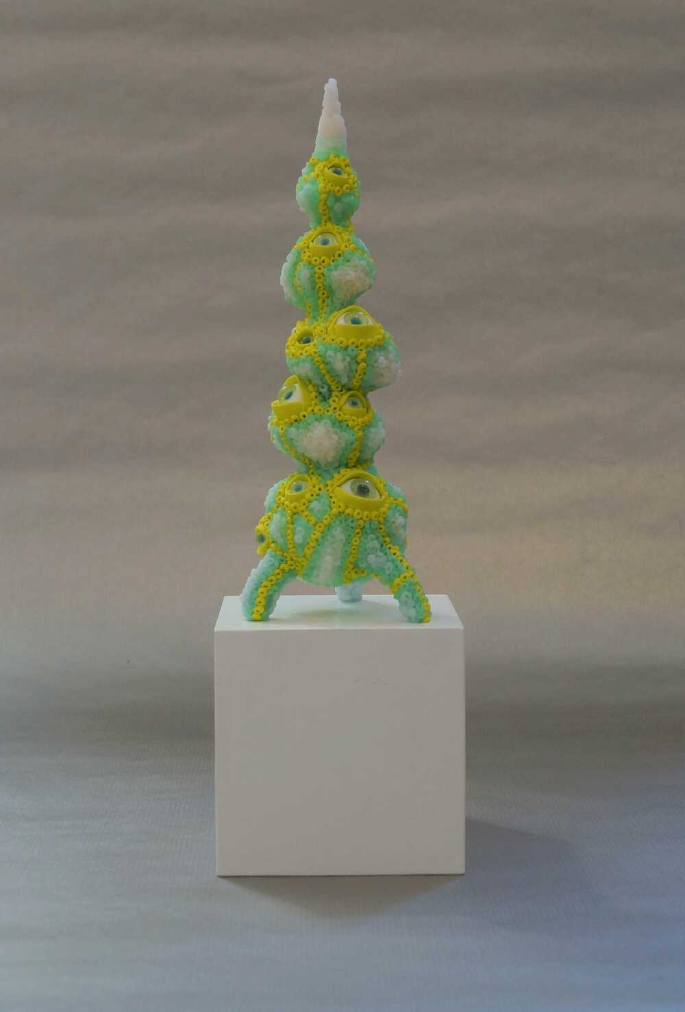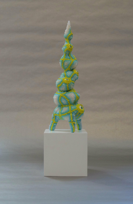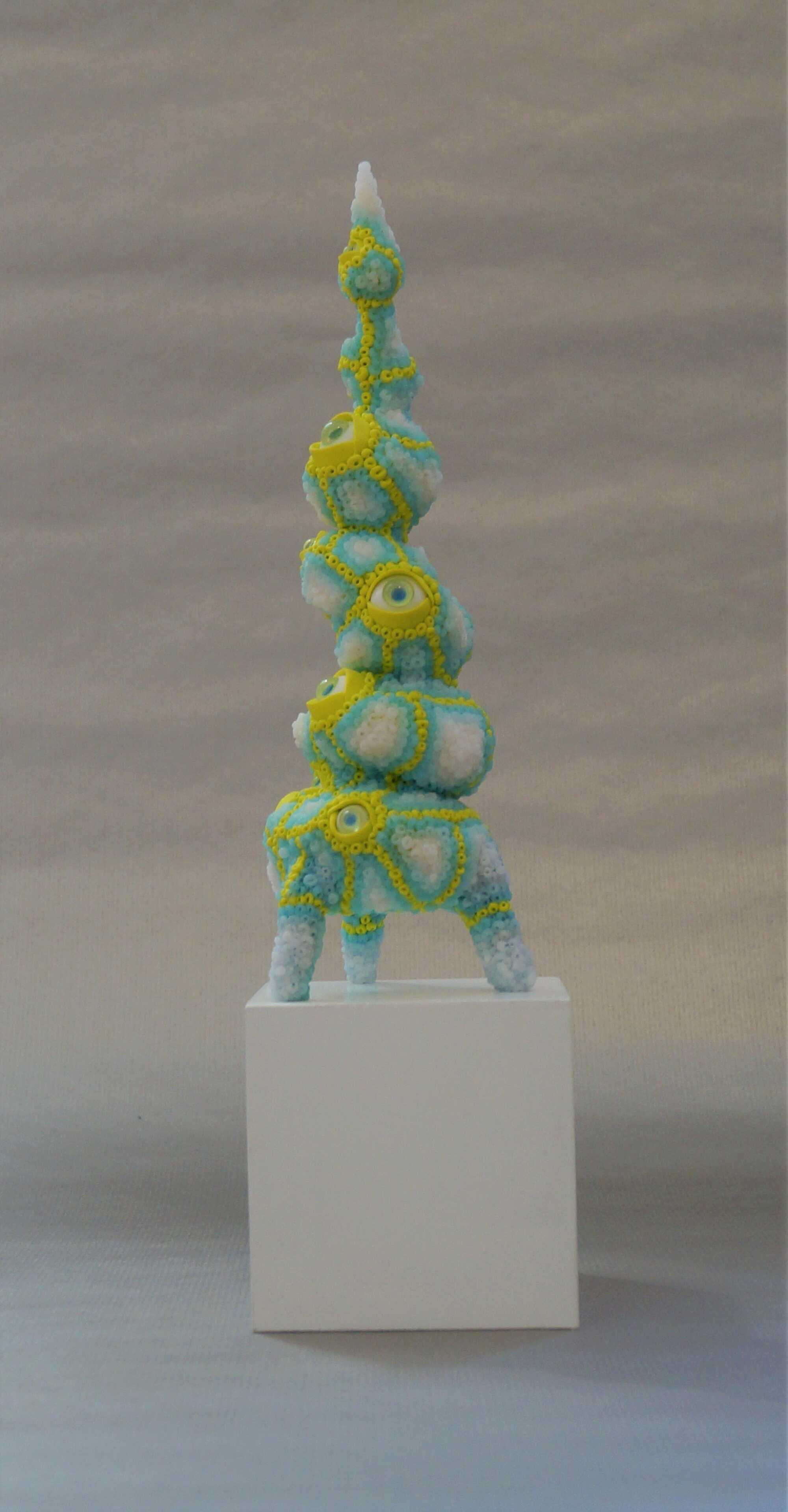 This sculpture is made of polymer clay and has glass eyes. The base is made of wood.