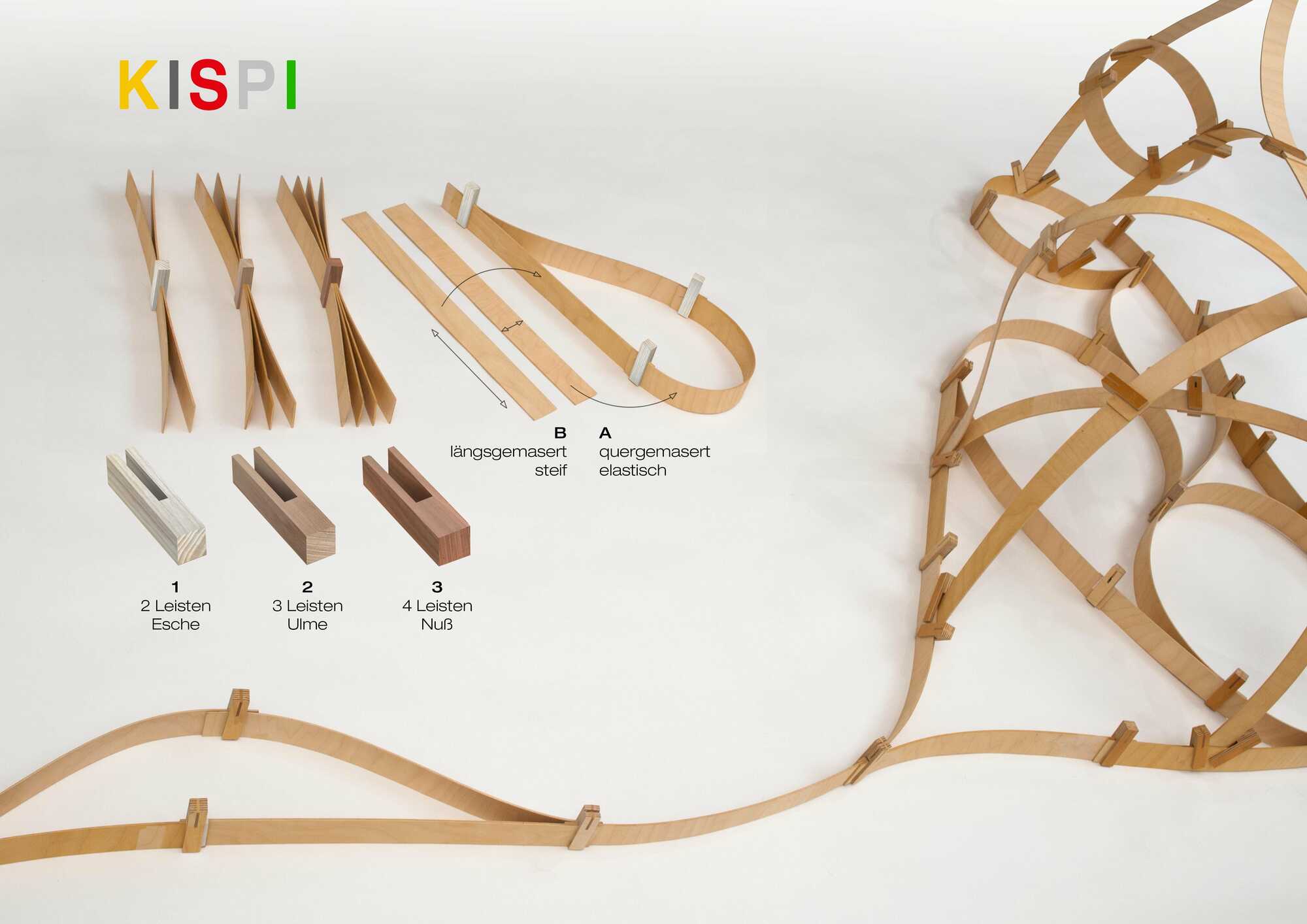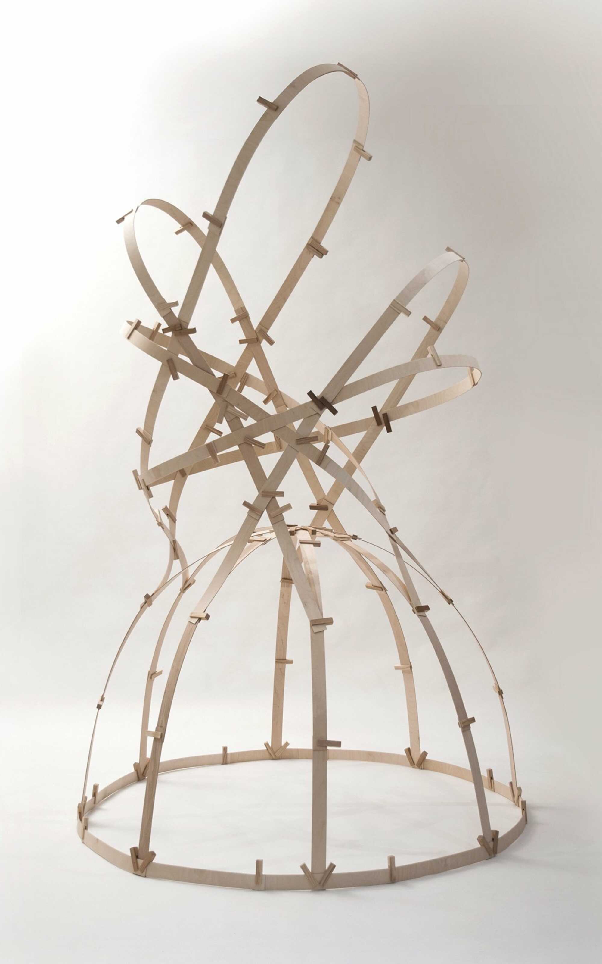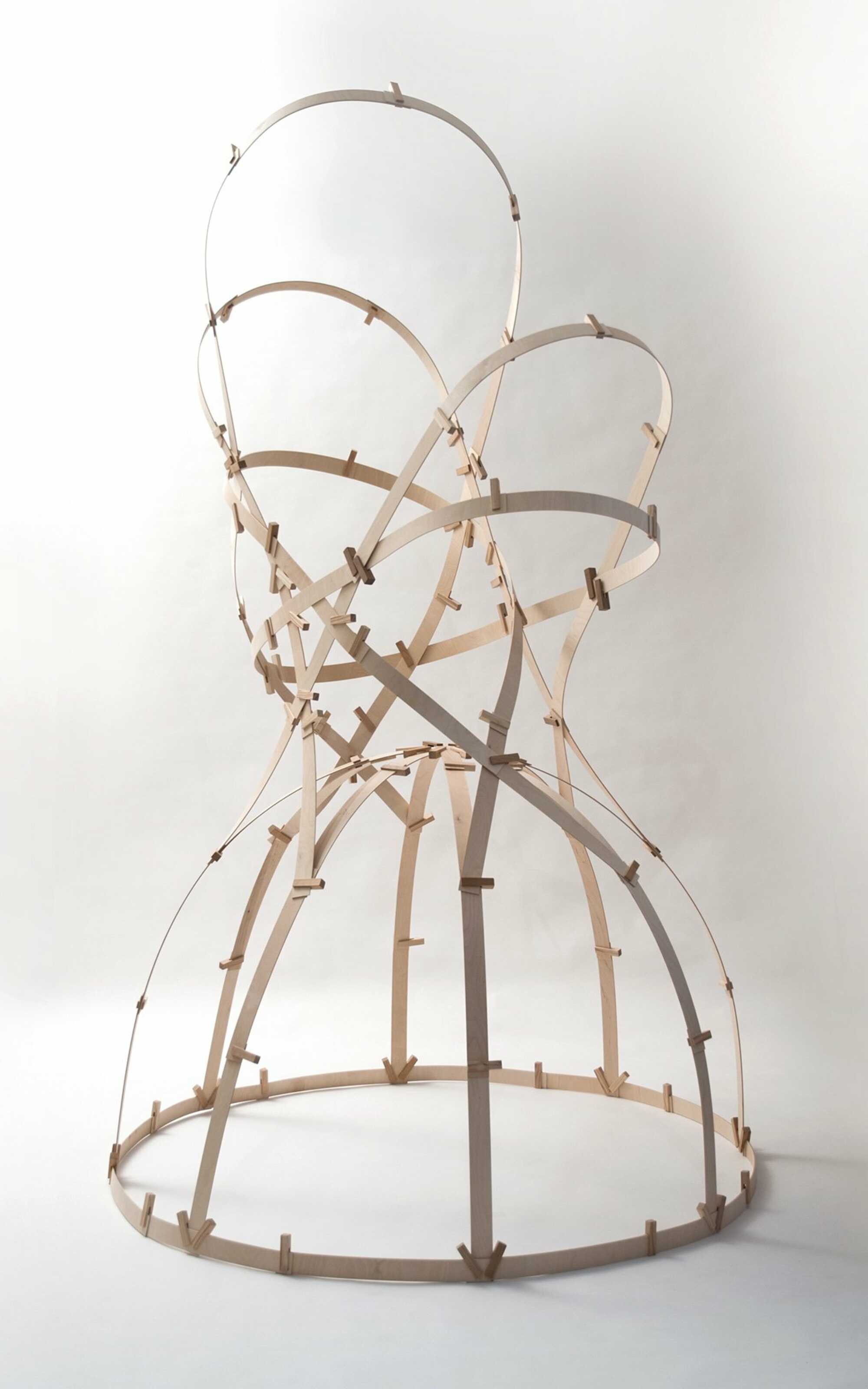 The strips of wood are joined together with wooden clips, which causes emerging tensions (ideal) forms to emerge as if by themselves.