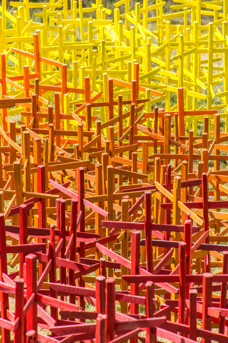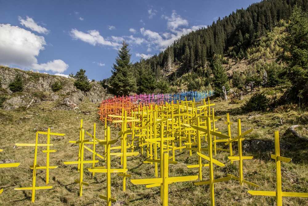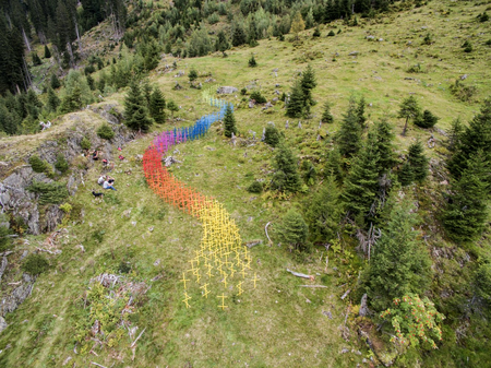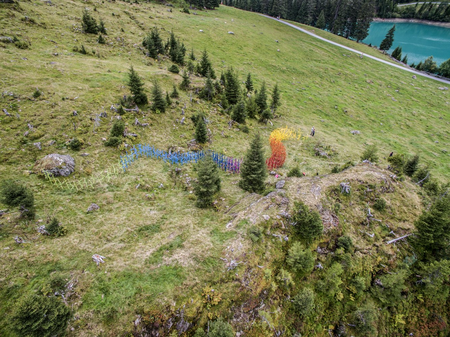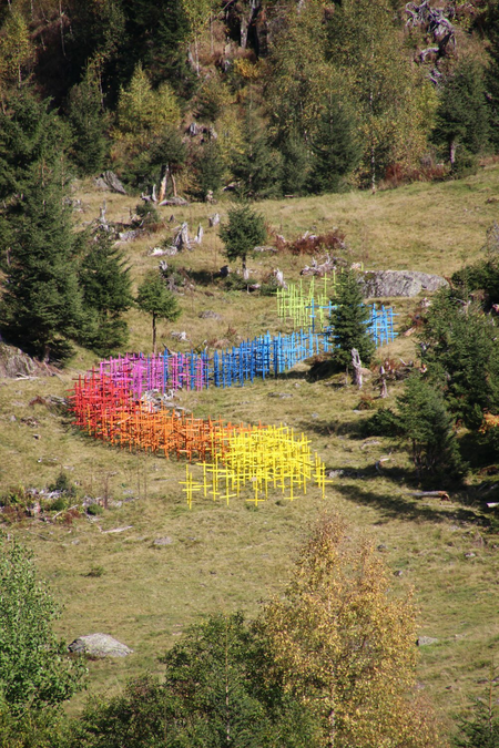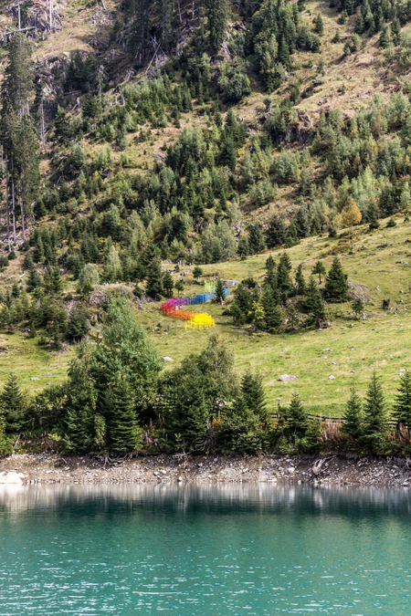 Diese Installation wurde im Rahmen vom 4. Kulinarik & Kunst Festival 2018 in St. Anton am Arlberg realisiert und zeigt einen regenbogenfarbigen Flussverlauf aus lackierten Heumännchen, der in den Verwallstausee mündet.