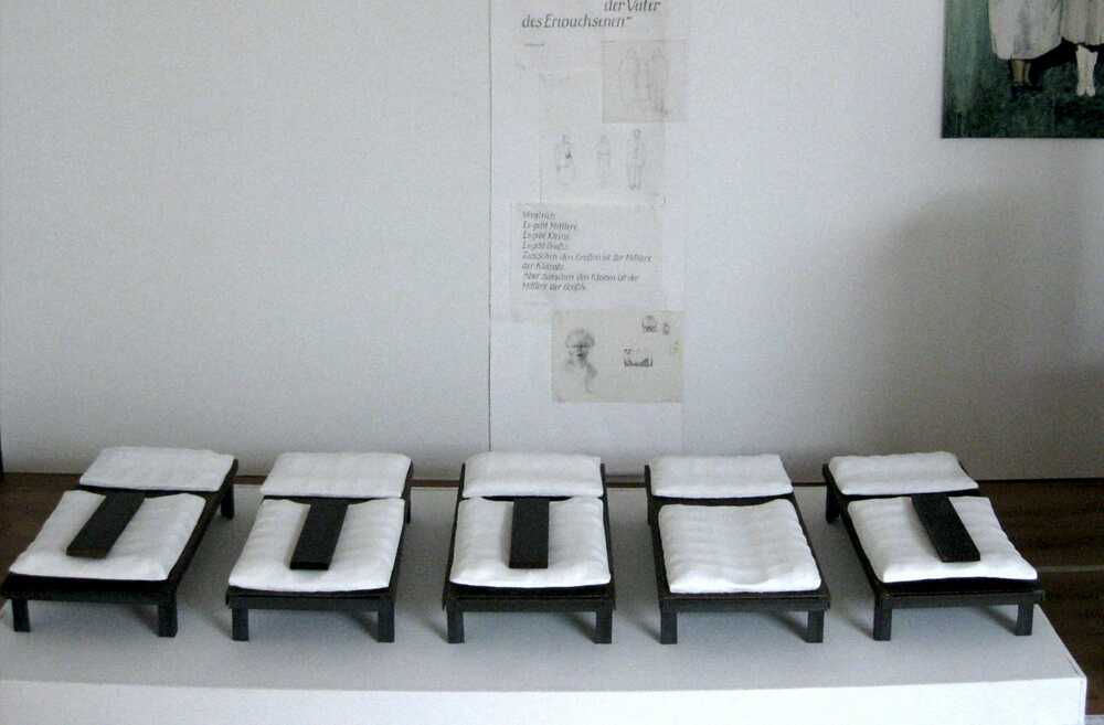 Auf einem Podest stehen aufgereiht 5 aus Eisenblech und Winkeleisen geschweißte Bettgestelle. Bettdecken und Kopfkissen Keramik,Keramikkaltfarbe, weiß.Ein Bett ist leer, auf 4 Bettdecken liegt ein 10mm dickes Bandeisen, Anwesendheit symbolisierend. Die Arbeit entstand im Jahr der massiven aufgedeckten Kindesmissbrauchsfälle in Heimen und Internaten!