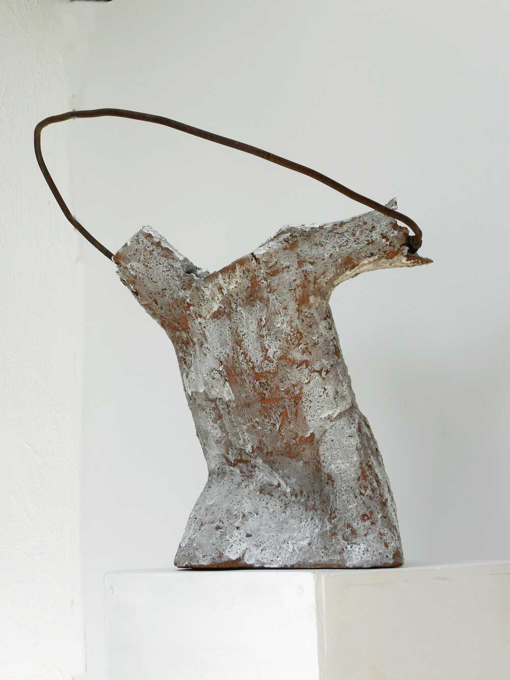 Schwarz schamottierter Ton, weiße Engobe, Fundeisen, Klebemontage