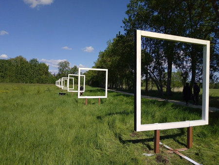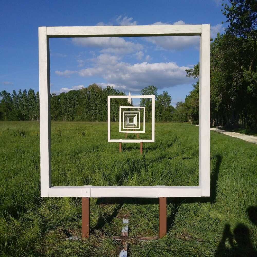 This is a large landscape installation.There ar 8 wooden squares fixed on steel constructions. They are painted white from one side, black from the other side. They become smaller in one direction. So you think there is a wider space, because there is a optical effect like in perspective drawing. The artwork is made with my wife Anna for an outdoor exhibition at Beau lieu de Loche in France. We are looking to realize it also n another place.