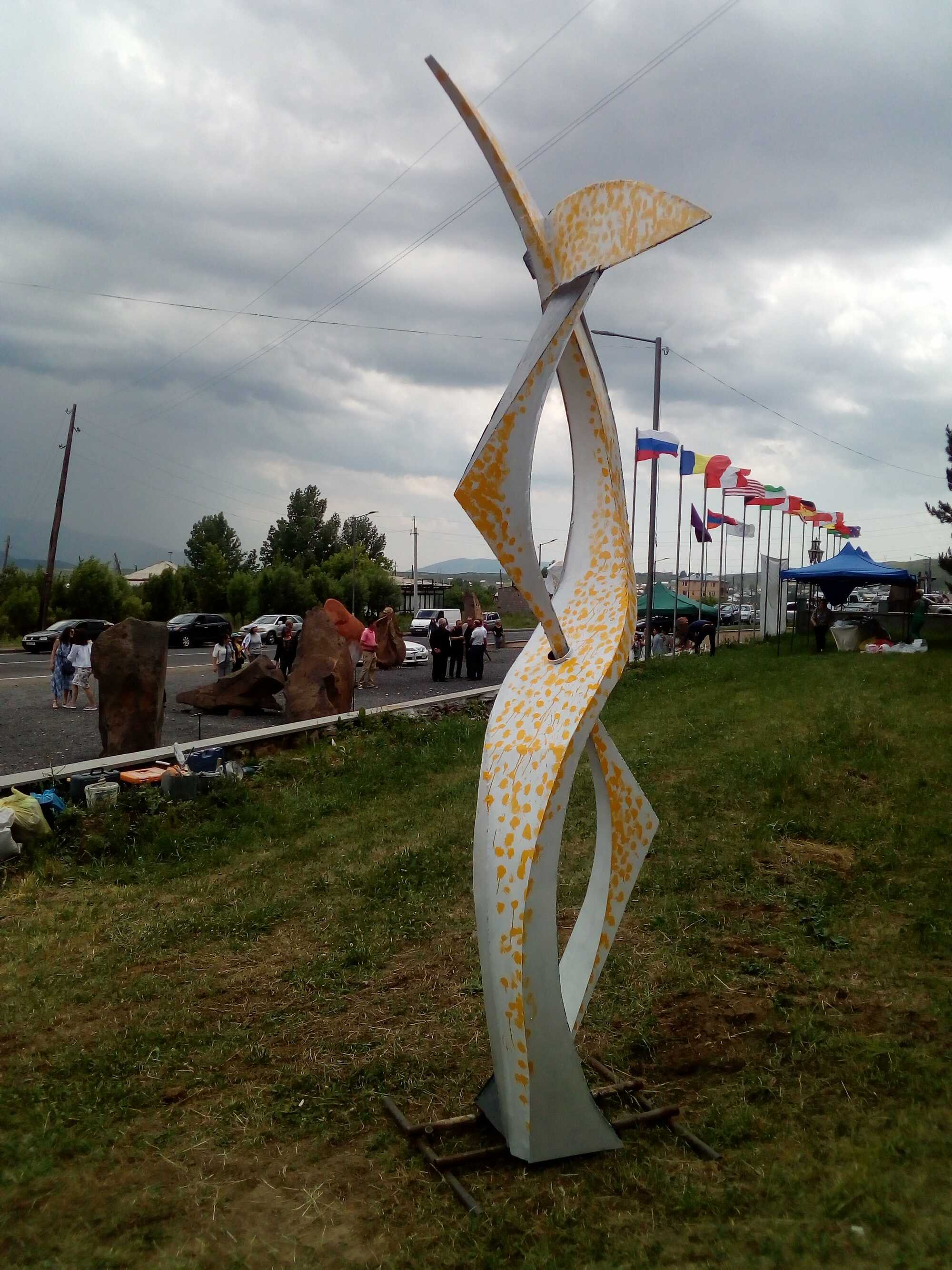 This steel sculptue is made durin a symposium in Aparan/Armenia. There two strands which penetrate each other. The top was a improvisation with the rest of the steel sheet. It's painted black and white. On the white side is also yello colour