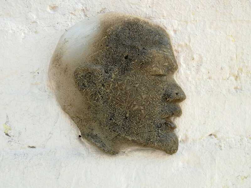 Leninrelief aus Eis (mit Moskauer Erde vermischt), an eine Wand in Moskau zusammen mit weiteren 200 Eis- Stickern: Steckdosen, Lichtschaltern und Portraits von Lenin und Putin) im Januar und Februar 2018 festgefroren.