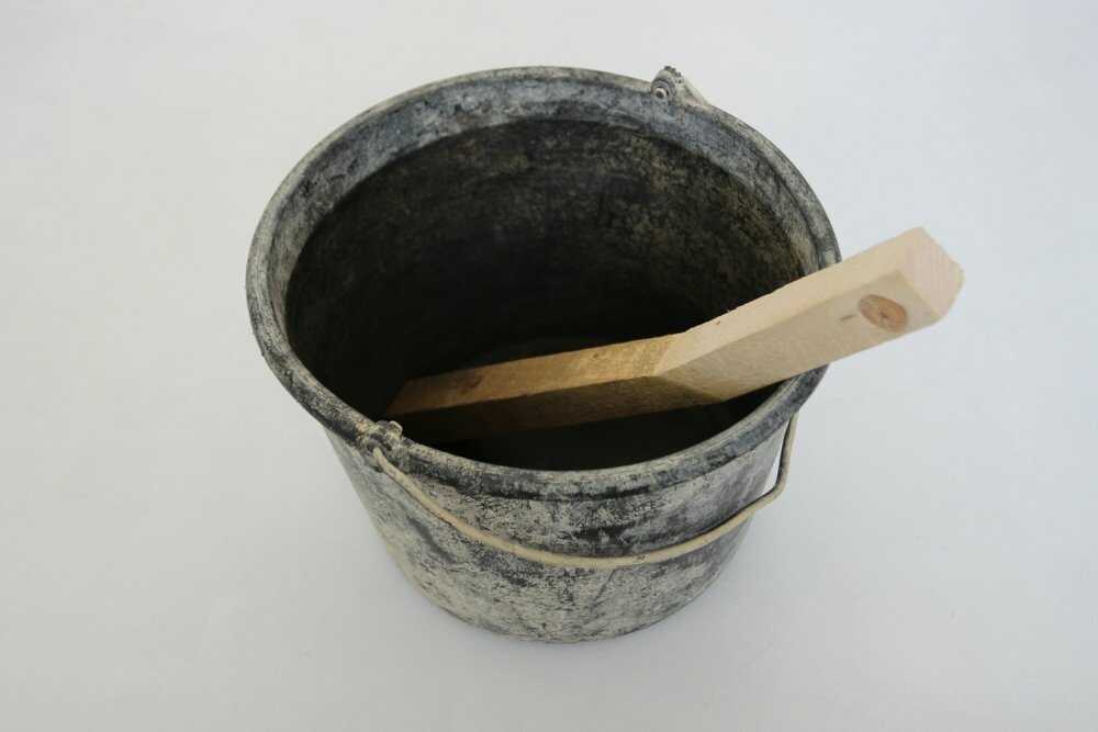 Maurereimer (teilweise bis zur vermeintlichen Wasserstandslinie lackiert) mit Kantholz (mit "Knick" im Lichtbrechungswinkel des Wassers)