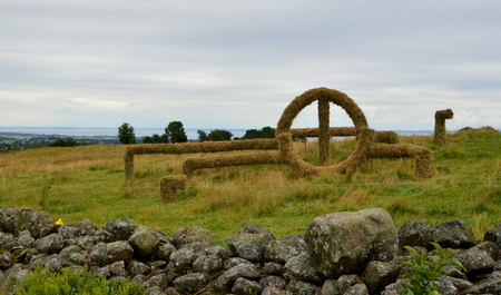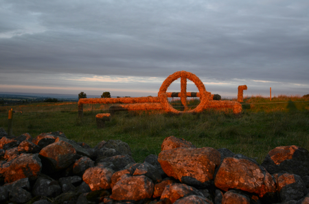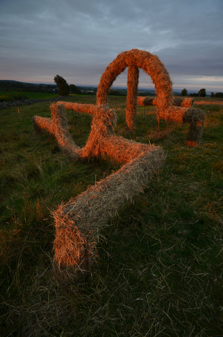 In the south of Sweden there are still many gravehills of the bronze age and rockcarvings that may be even older. The sun was worshipped, it was depicted as the so called Sun Cross. The landscape is changed nowadays in a functional way, it can be a nature reserve or used for (industrial) farming or tourism. In many places pipelines criss cross countries to supply fuel for our energy needs. I used the graphic quality of these pipelines, popping in and out of the ground, to depict ways of human traces in the landscape. Seen from the center of the otherwise randomly installed pipes the prehistoric sign of the Sun Cross appears, as a reminder of a different view on the earth that we inhabit.