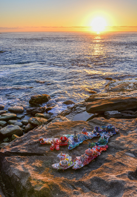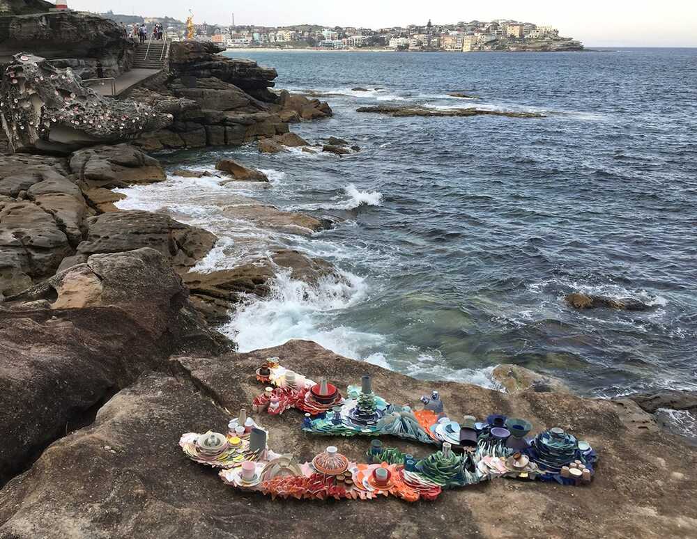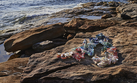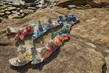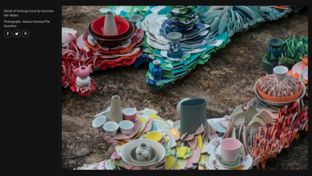 KintsugiCoral is inspired by the shape of a piece of coral, but as a coral is built up as a skeleton the sculpture is overgrown with broken pottery. Human culture and a piece of nature have intermingled into a new form of coexistence. The work refers to the coral as an endangered species, under serious pressure of human activities. From this point of view, the pottery ‘suffocates’ the coral. On the other hand it offers a positive view on the ecological drama, because coral and humans are interdependent. The broken pottery refers also to the Japanese art of ‘kintsugi’. It means that by repairing a piece of broken pottery (with gold) it will gain value and meaning. In this case the pottery forms a new whole as a sculpture, a natural growth on the coral shape. The philosophy behind kintsugi, about acceptance of loss and change, can also be applied to the sculpture. Regarding nature and the coral reefs in particular, change is something that has to be dealt with, and repairing the damage is the next step.