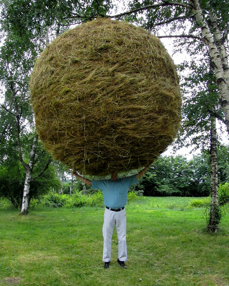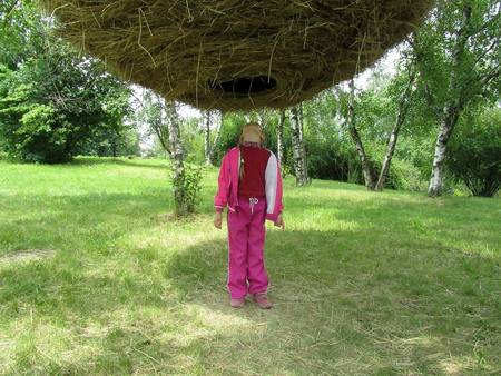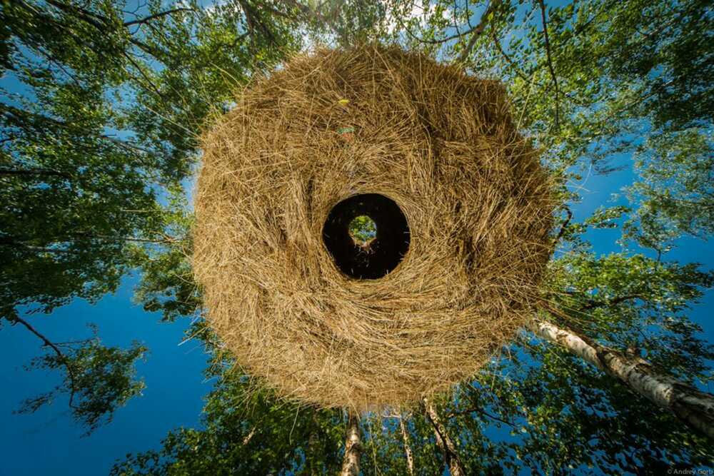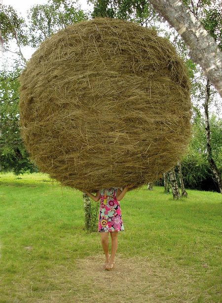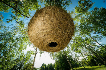A huge hollow hayball is suspended in the citypark of Kiev, offering a place to be alone and isolated in a natural surrounding. Just the smell of the grass, the feel of the hay and a view towards the sky.