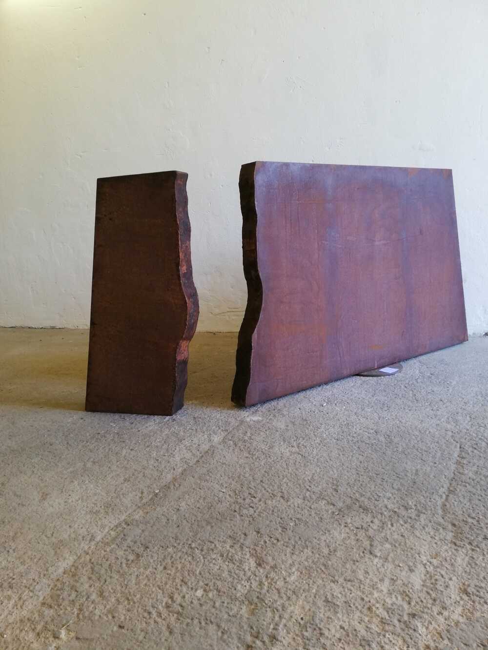 Aus der Serie "klimaWANDEL", Stahlblock, gerostet, zweiteilig, 140x100x10cm. Mit dieser Sculptur soll verdeutlich werden das der Klimawandel schon ein Teil seines Weges gezogen ist und wohl unbeirrt weiter fortschreitet.