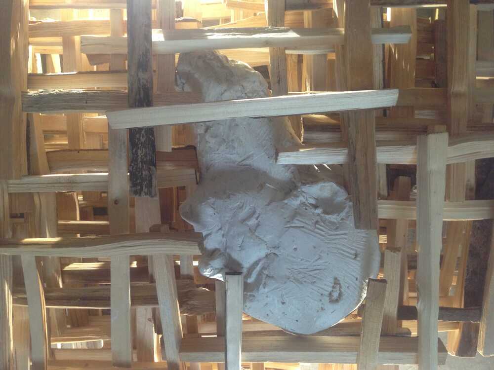 Eingebauter Portraitkopf aus Gips , in gespaltenes und gestapeltes Fichtenholz,