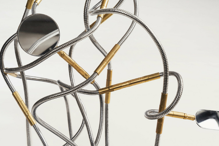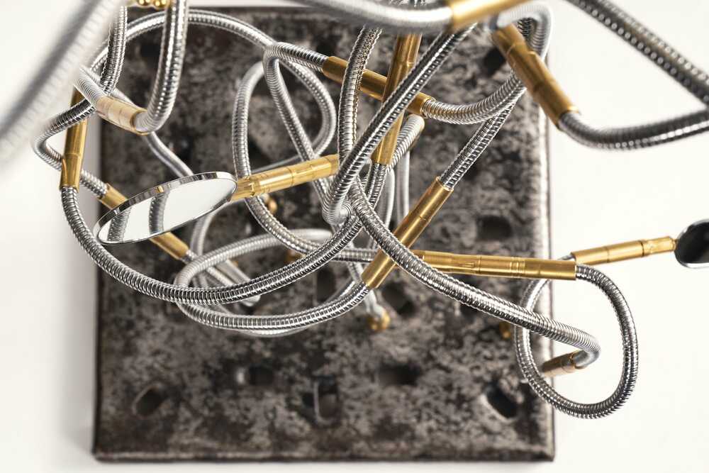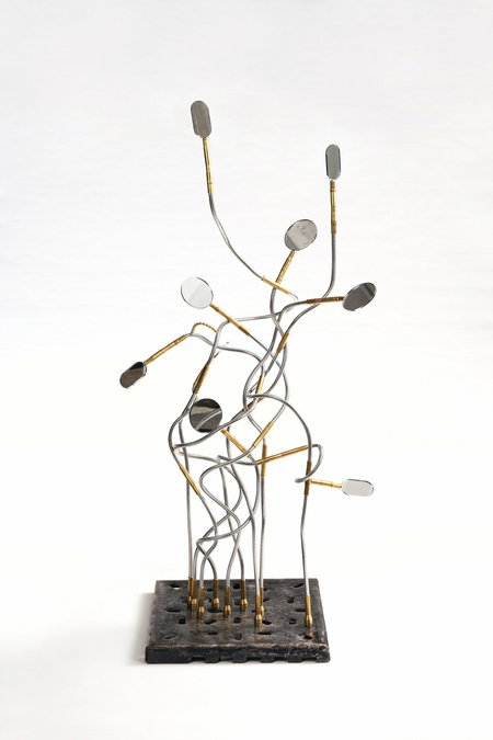 Steel cables, mirror, found metal stand