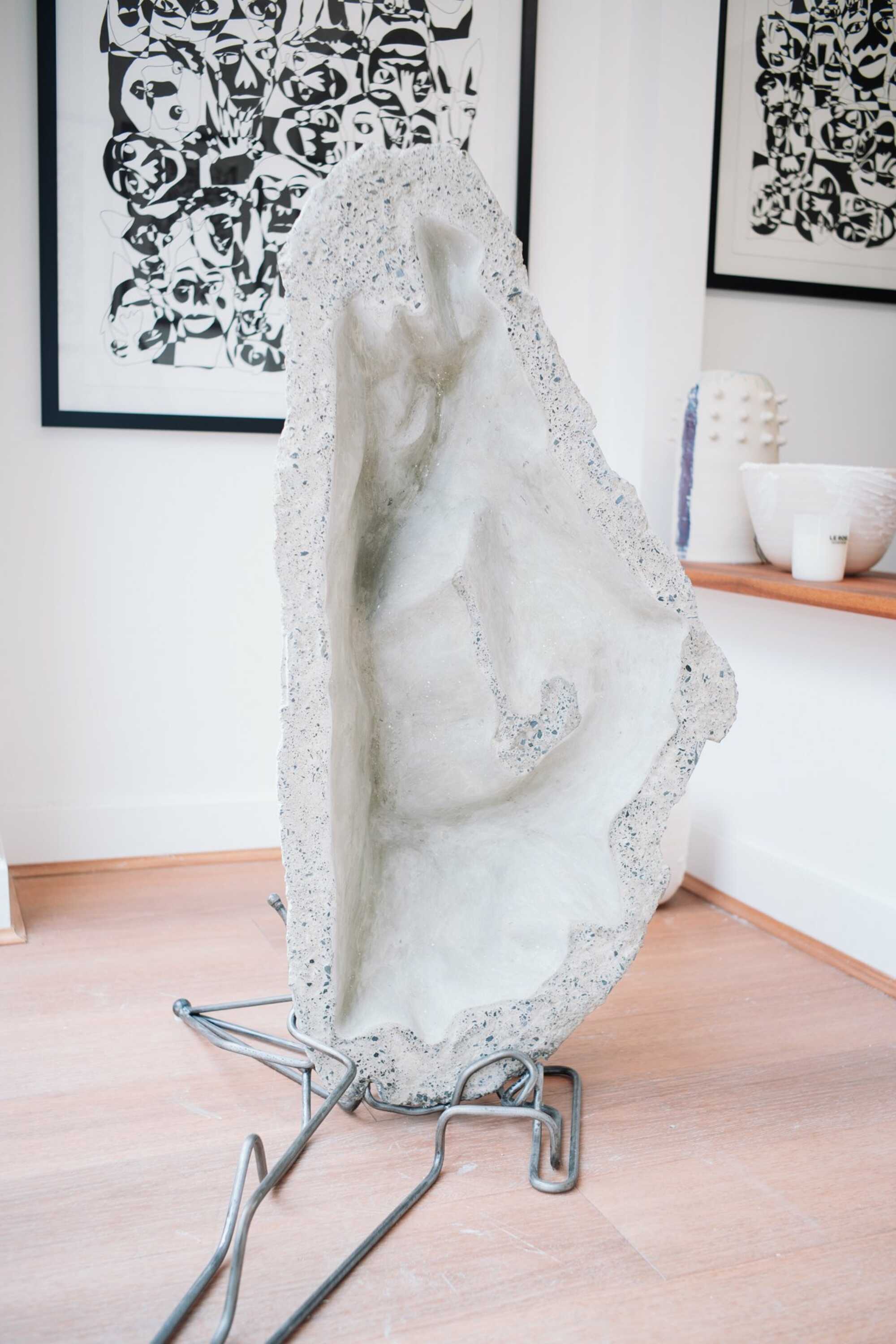 Talof is a representation of a natural form or being that you may come across on your travels on the dwarf Planet Pluto. Similar shades, tones, and lines have been replicated from the Artists vision of the crust of the icy cored inter galactic parallel platform being Pluto. The materials used in this piece originate from the earth and hold a significant representation of similar materials that may be collected in the bodies of Pluto beings and forms.